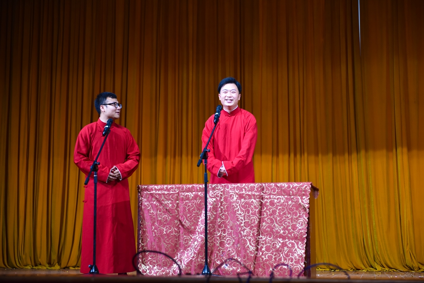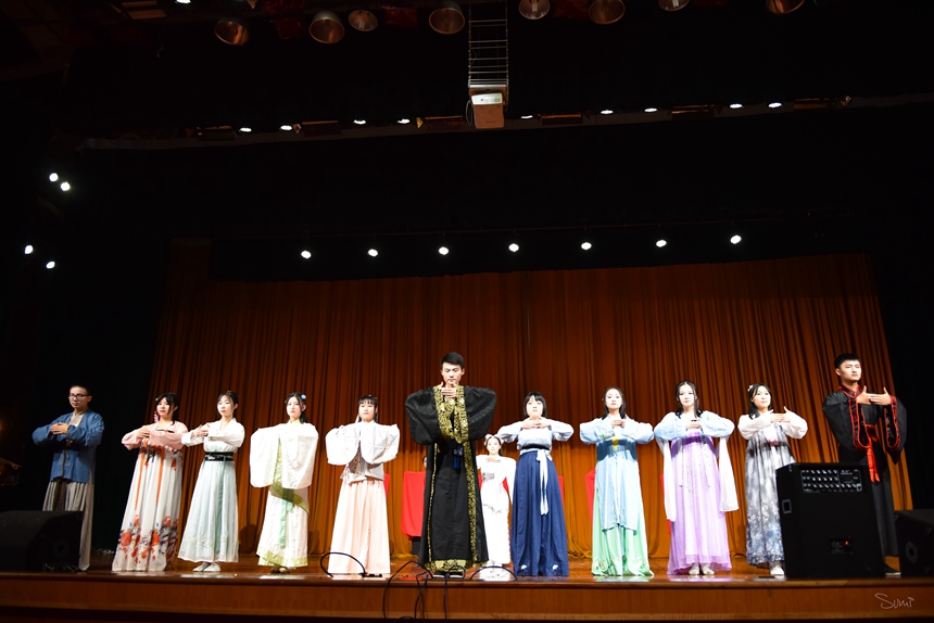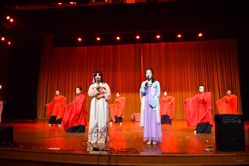 “呦呦鹿鸣,食野之萍”汉文化社与动漫社带来的歌曲、舞蹈、汉服展示,演绎出中华文化的博大精深,也呈现了多元文化的独特魅力。来自省曲艺协会的两位特邀演员带来的对口相声《颠倒话》让现场观众笑声不断。