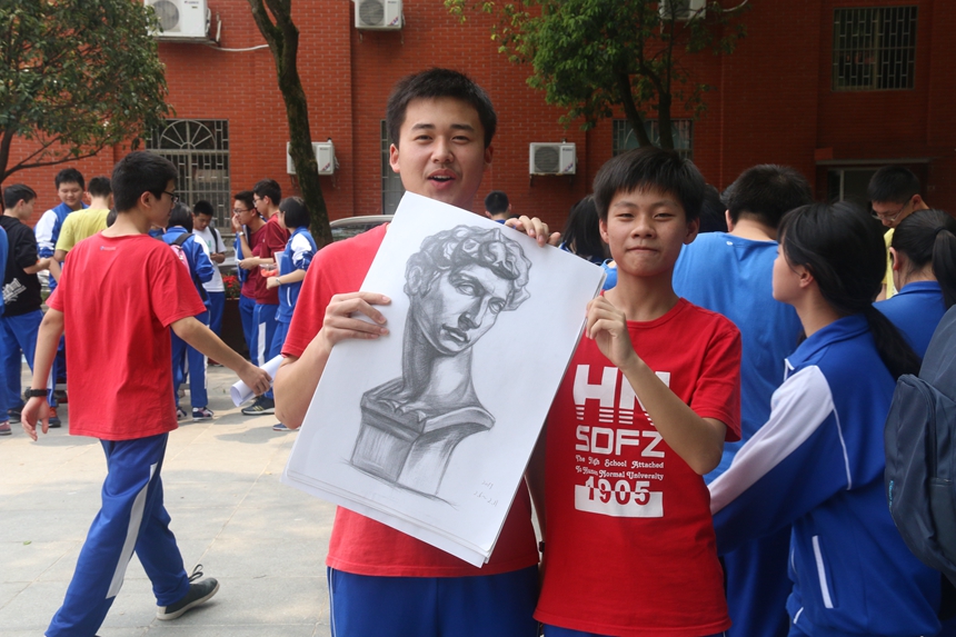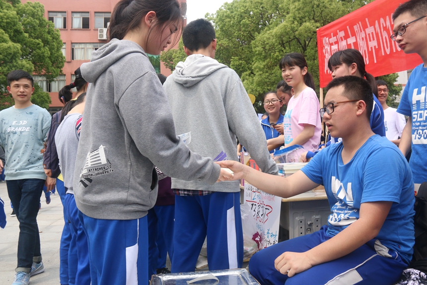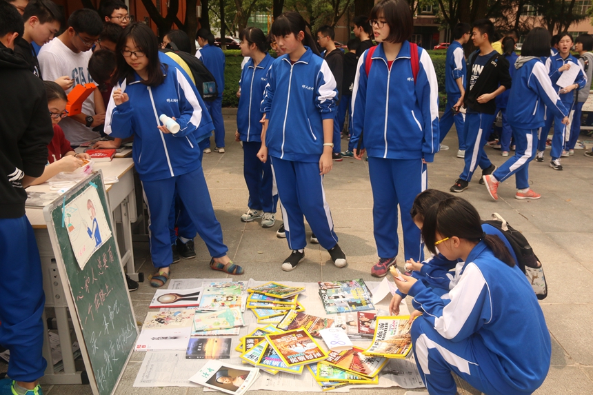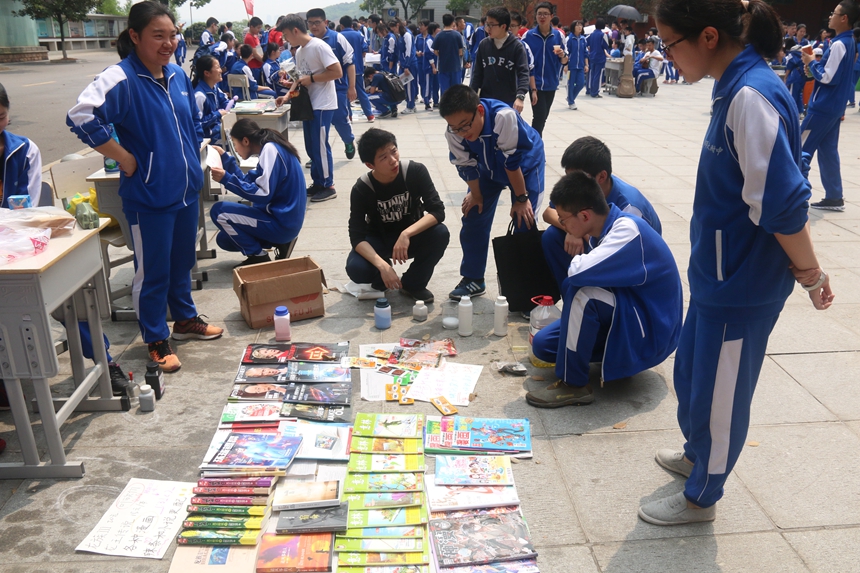 15日中午,天气晴朗,万里无云,同学们精心制作的招牌在阳光之下熠熠生辉。惟一楼前的广场上人声鼎沸、热闹非凡,同学们以班级为单位摆出摊位,售卖各类物品。摊位上的“商品”从最常见的书籍、杂志到各式书签、文具,从各种各样的零食、水果到大受欢迎的冰激凌,从意义独特的“教师签名照”到同学们一展手艺、现场制作的橡皮印章,可谓是琳琅满目、一应俱全。 除让人目不暇接的商品,各个摊位上的景象也是一派繁忙。“摊主”们或大声推销自己班级的商品,或迅速又不失仔细地为购买了商品的同学找零;“顾客”们有的站在摊位前精心挑选自己喜欢的物品,有的正想尽办法“讨价还价”;更有同学四处“拉客”,即使在较为冷清的摊位上,管理员也没有丝毫闲暇,忙着整理各类商品。欢笑声弥漫在整片广场。