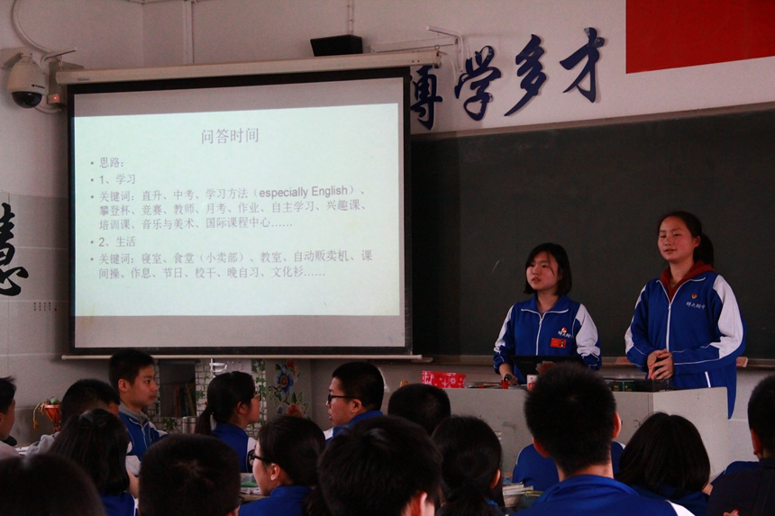 接着,回访团成员分成小组,到初三各个班级进行宣讲,为学弟学妹介绍附中校园风貌、课程设置、综合实践活动等,还传授了中考复习的心得,为学弟学妹冲刺中考鼓劲加油。同时,还设置了提问环节,为初三学生面临的各种困惑支招。各班的宣讲活动进行得十分顺利,回访团成员充分的准备和精彩的宣讲收获了很好的效果。