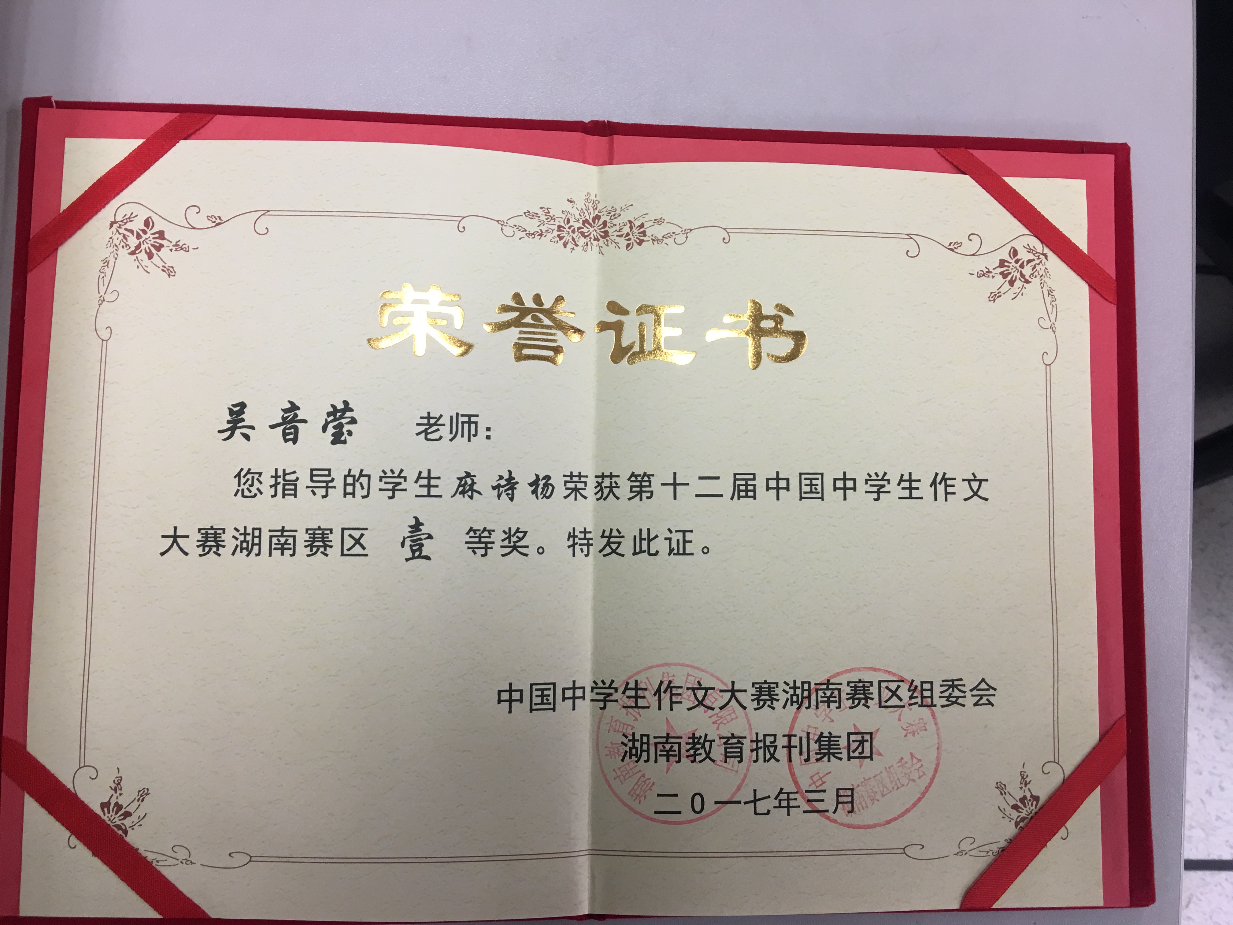 今年1月,我校麻诗杨同学获湖南赛区一等奖,他的作品上交至中国中学生作文大赛全国评审委员会,经中国作家协会、人民教育出版社等单位的作家、学者认真复评,从全国各参赛省、直辖市和特别行政区的中学生中脱颖而出,取得了总决赛的入场券。