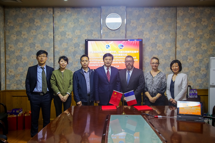 基于两校友谊的深入发展,法国代表团此行的一项重要任务便是与我校续签新协议。14日下午,两校友好协议续签仪式在学校四会议室举行,谢永红校长代表学校与顾拜旦高中续签了第2个五年合作协议。同时,宾主双方愉快地回顾了两校五年的友好交流,就进一步深化合作交流进行了深入探讨,并在教师研修、学生交换学习等方面达成了共识。