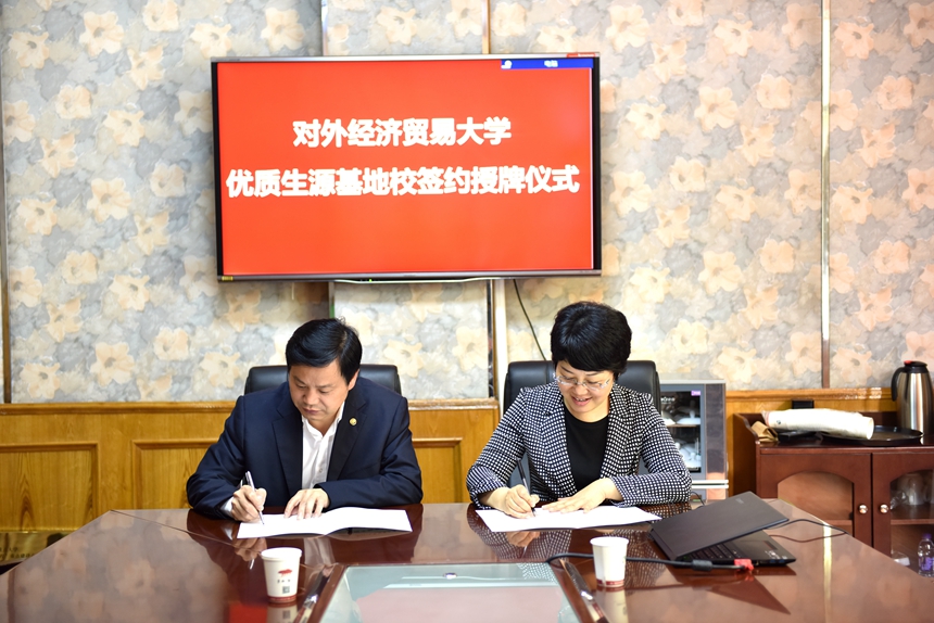 随后,文君副书记代表外经济贸易大学与我校签署了优质生源基地合作协议,并授予我校“优质生源基地”牌。