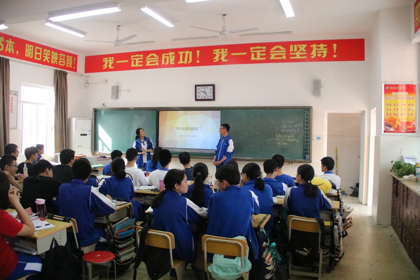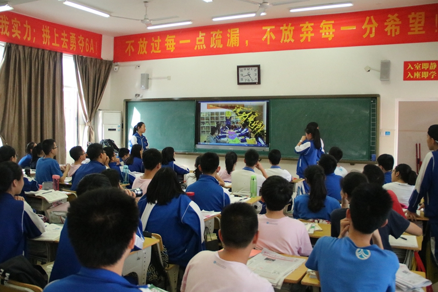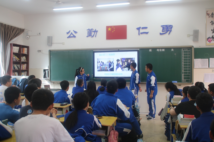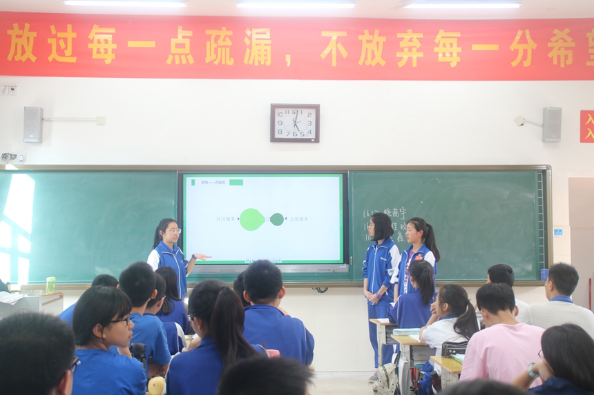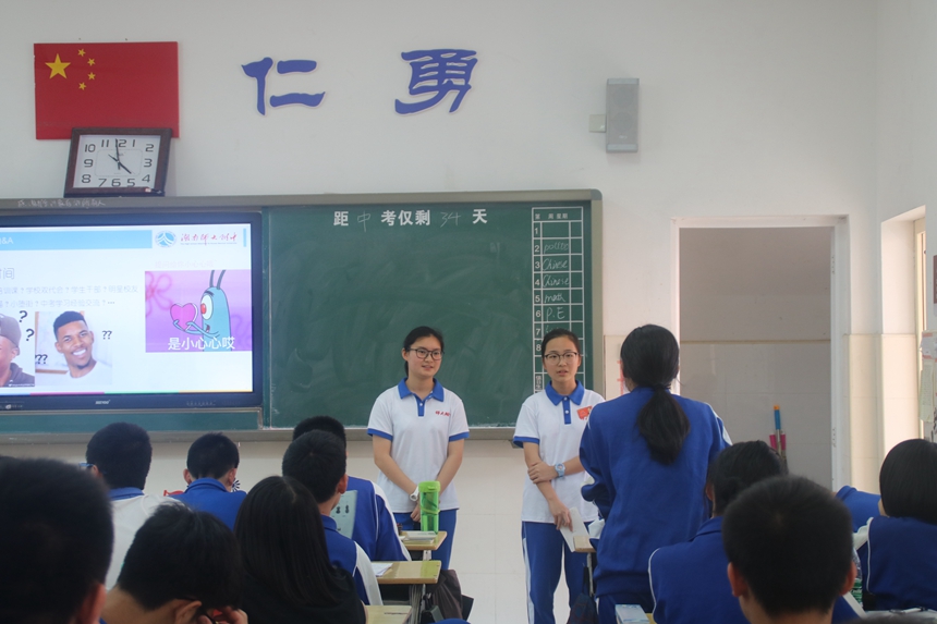 学长团到达附中梅溪湖中学后,受到了团委书记罗旭洁和学生干部的热情接待。合影留念后,学长团成员分成小组,到九年级各班进行宣讲。宣讲同学从校园风貌、课程设置、社会实践、校园活动等几个方面为学弟学妹介绍了附中,还传授了不少中考冲刺心得,并在互动环节为九年级学生面临的各种困惑支招。最后,宣讲团送出了精心准备的小礼物,为学弟学妹冲刺中考鼓劲加油。各班的宣讲活动气氛十分活跃,教室里不时传出掌声。