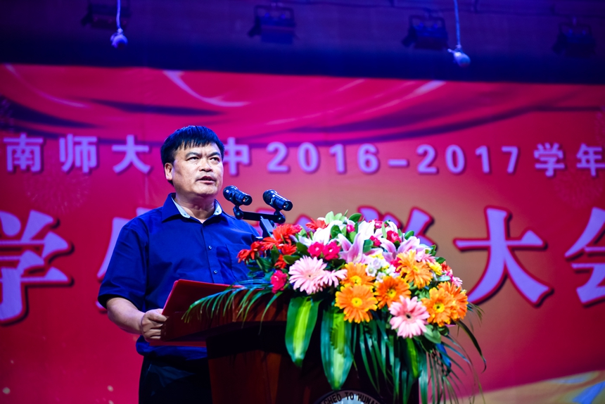 最后,陈迪勋发表讲话。他对获奖的同学表示真诚的祝贺,并对未来作出了三个层面的期待:期待同学们不断提升自我、完善自我,真正成为“素质全面、个性彰显”的优秀附中人;期待老师认真担负起学生人生导师的责任,与同学共成长、同进步,实现真正意义的“全员育人”,构建和谐、灵动的美丽校园;期待我们的学校在国家全面建设小康社会的决胜时期,抓抢国家大力推动教育现代化的良机,全面深化教育教学改革,以先进的理念,充满智慧的行动,推进我校的“十三五”改革和发展纲要,为建设“高质量、现代化、研究型、很幸福”的卓越高中而努力!
