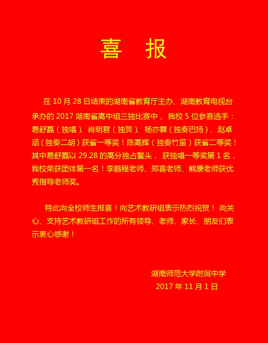 新闻中心 附中新闻 通知公告 最新动态 教育视点 集团学校新闻联播 媒体聚焦 工作安排 微信附中 我校师生在2017年湖南省三独比赛中荣获佳绩 发布:校办公室 来源:学生发展处 日期:2017-11-01 人气:分享到: 上一篇:“国培计划”——乡村高中骨干教师新高考改革 专题研修项目培训结业典礼圆满结束 下一篇:湖南省高中教学副校长新高考改革专题研修班学员来校考察交流 通知公告 更多 湖南师范大学附属中学2024年度废 湖南师范大学附属中学化学实验室 湖南师范大学附属中学出国(境) 关于开展2024年暑假教科研论文评 湖南师范大学附属中学2024年暑假 关于申报“十四五”课题2024年度 最新动态 更多