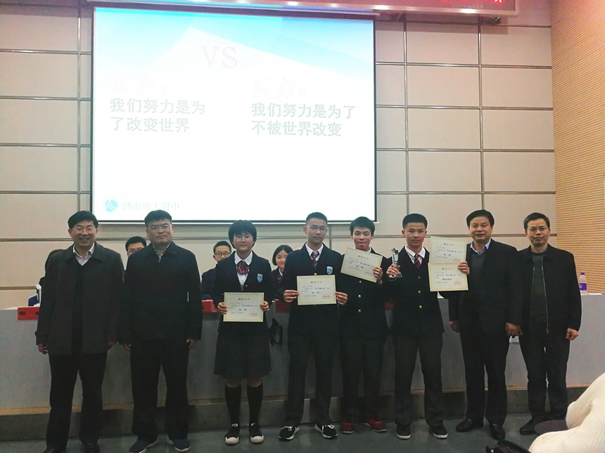 开幕式后,由学生社团联合会、DEBATE辩论协会举办的第六届“新生杯”辩论赛总决赛在期待中开始。团委书记李钊、政治教研组杨征老师、语文教研组谢兰萍老师、历史教研组黄雅芩老师、湖南师范大学辩论队队长李成蹊同学担任比赛评委。