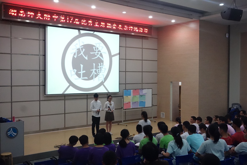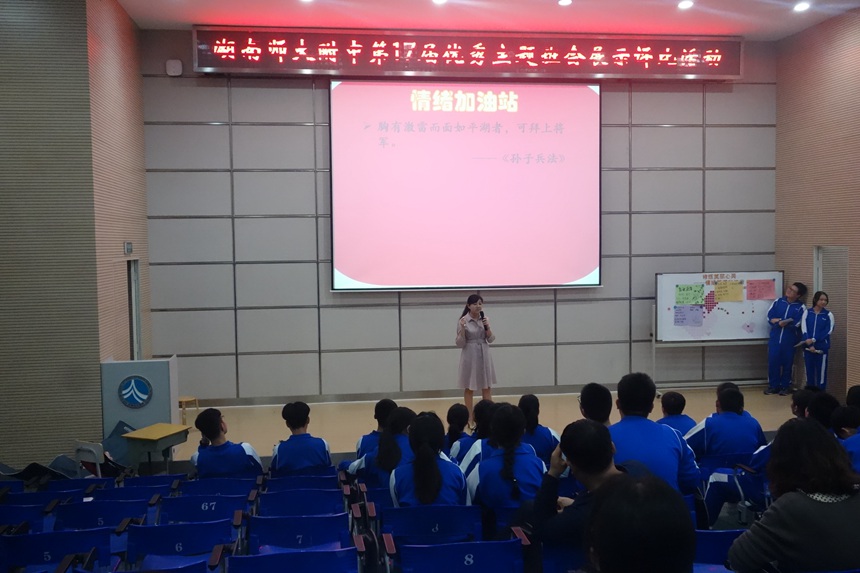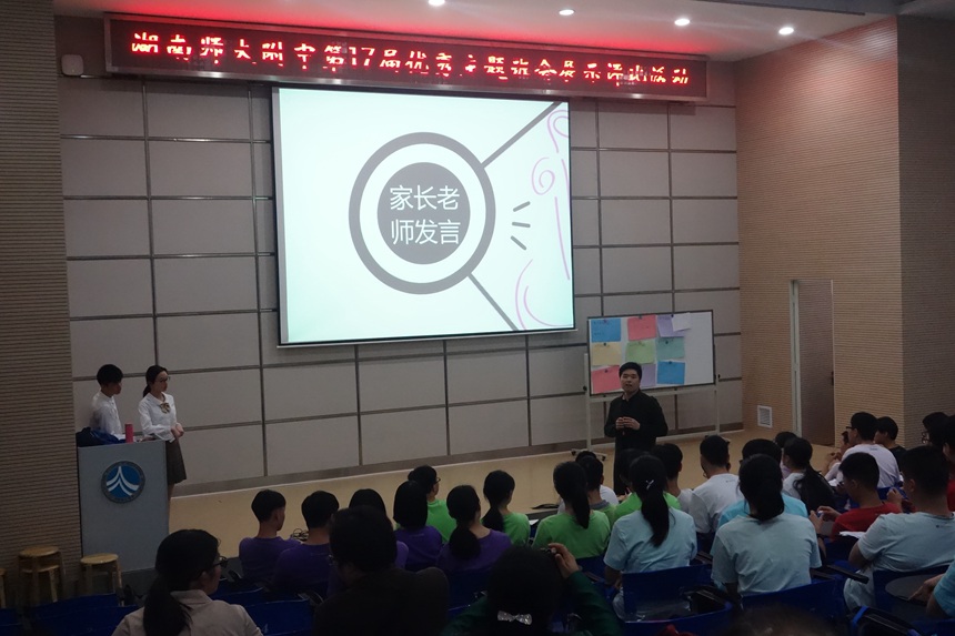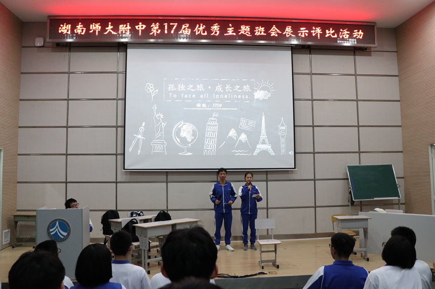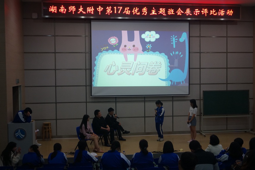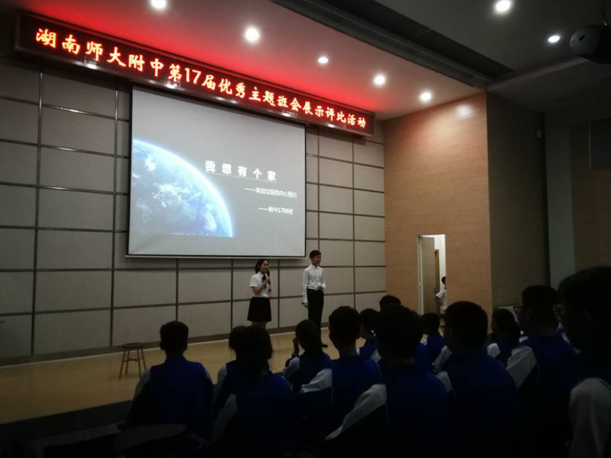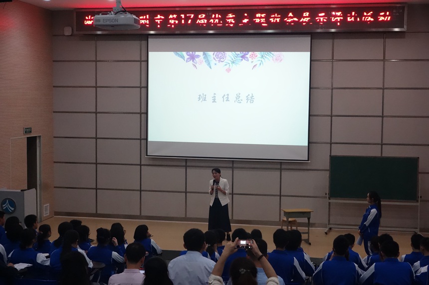刘雄昆老师带领1713班同学展示了主题班会《解忧杂货店—写给青春的信》,张光新老师带领1704班同学展示了主题班会《孤独之旅·成长之旅》,吴浩老师带领1706班同学展示了主题班会《我想有个家》,彭如倩老师带领1709班同学展示了主题班会《滚蛋吧,挫折君!》,王心怡老师带领1721班同学展示了主题班会《修炼美丽心灵—情绪管理我能行》,明正球老师带领1714班同学展示了主题班会《爱你在心口难开—探讨家庭交流的正确打开方式》,谭天俊老师带领1722班同学展示了主题班会《认识自我,实现自我》,欧阳普老师带领1613班同学展示了主题班会《沟通从心开始》,罗娟老师带领1621班同学展示了主题班会《生态文明教育—只有一个地球》。九堂班会课内容丰富多彩,紧扣主题,具有时代感,震撼了学生心灵,充分发挥了主题班会育人功能。