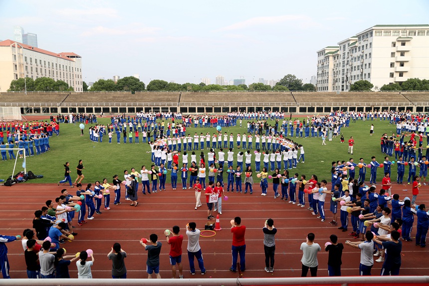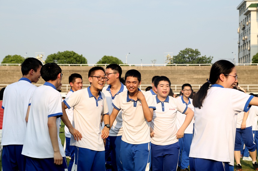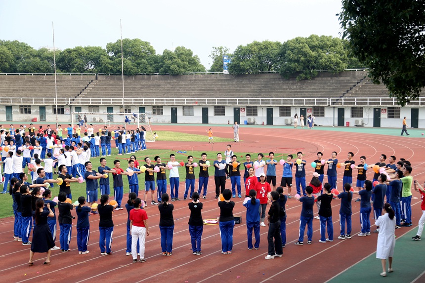 “捏捏你的肩呀,一起来锻炼呀!捶捶你的背呀,就你最有味呀;摸摸你的头呀,头上有点油呀!摸摸你的头呀,今年你最牛呀……”在主持人幽默风趣、热情四射的引导下,同学们为站在自己前方的同学做“阳光SPA”,操场上顿时炸开了锅,嬉戏欢笑声一片。