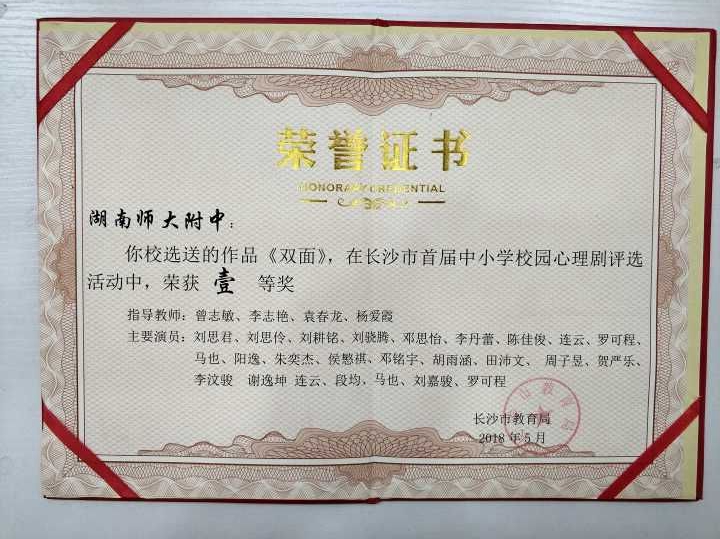 本次获奖是自2017年11月《心里 医生》、《梦境旅人》、《初心》等心理剧获湖南省校园心理剧观摩评比一、二等奖后又一次新的收获。