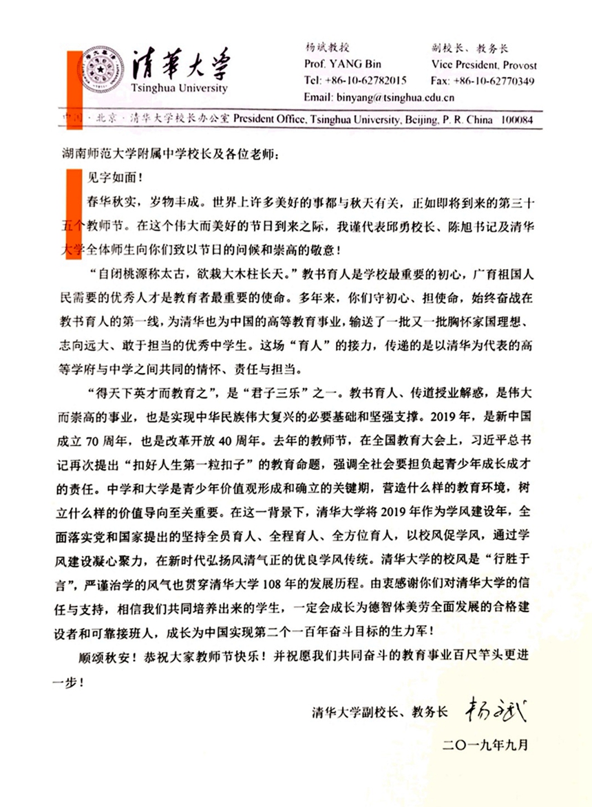 新闻中心 附中新闻 通知公告 最新动态 教育视点 集团学校新闻联播 媒体聚焦 工作安排 微信附中 清华大学等知名高校致信我校祝贺教师节 发布:管理员 来源:校办公室 日期:2019-09-11 人气:分享到: 第35个教师节前夕,清华大学、华东师范大学以及天津大学发来贺信,向我校教师致以节日的问候。 上一篇:学校隆重召开庆祝第35个教师节暨优秀教师表彰大会 下一篇:我校教师舞蹈《映山红》亮相全省教育系统庆祝新中国成立70周年“我和我的祖国”教职工文艺汇演 通知公告 更多 2025年劳动节放假通知 关于做好政工专业知识考试工作的 2026年多伦多大学士嘉堡校区绿色 2025年清明节放假通知 湖南师范大学附属中学2025年公开 湖南省教育厅关于做好湖南省教育 最新动态 更多