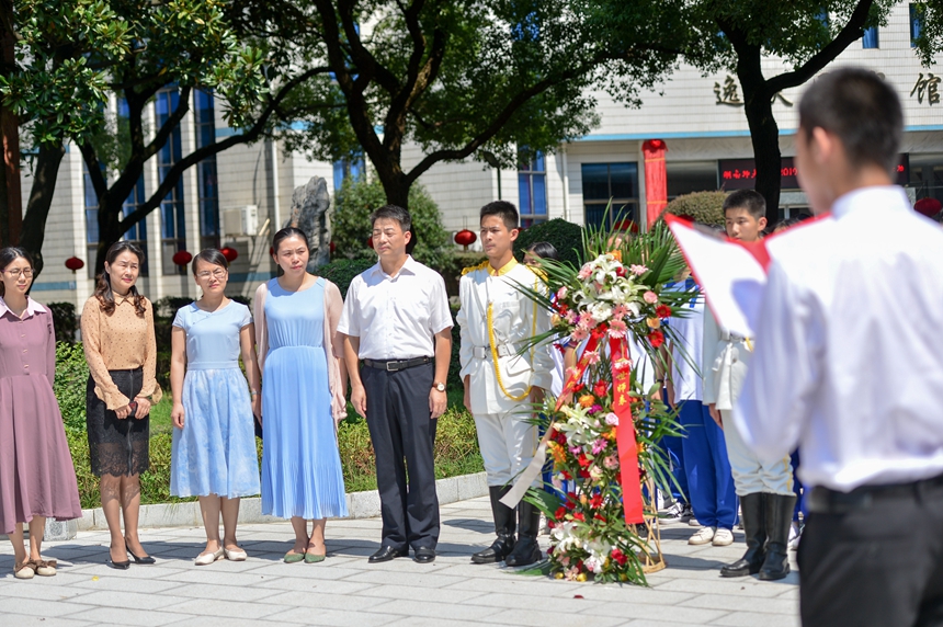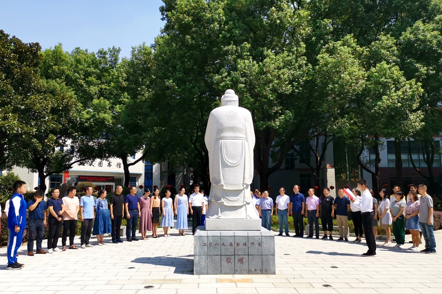 校长助理苏建祥与百余名师生代表站立于孔子雕像前,庄严肃穆。校仪仗队队员手持花篮,正步走向孔子雕像,将花篮敬献在雕像基座前。苏建祥缓步向前,仔细整理花篮缎带。国学社代表王冠博同学颂读祭文,与全体师生共同追忆先贤圣人孔子的生平事迹,表达了对万世师表的怀念与敬意,表明了同学们谨遵先生教诲、勇于创新、敢于拼搏,勇立时代潮头的决心。随后,师生齐诵《论语》,读先贤语录,沐圣贤智慧。诵毕,全体师生整理衣冠,神情肃穆,向孔子雕像三鞠躬。