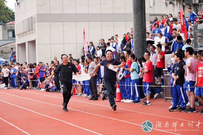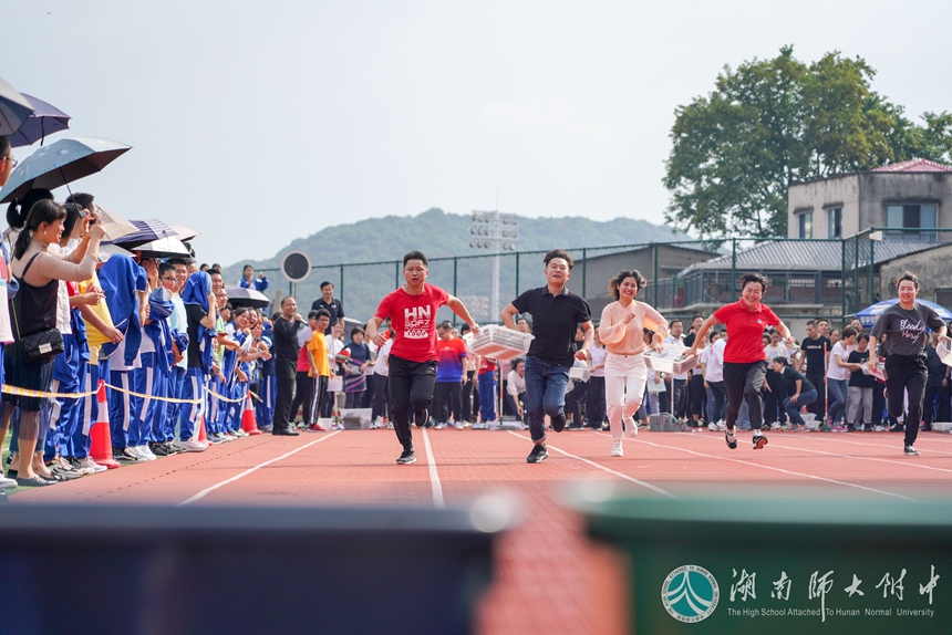 教师们身穿文化衫,全力奔跑,在蓝、绿、黄、黑四色垃圾桶前飞快地完成垃圾分类,将事先准备的垃圾放在相应的垃圾桶中,生怕有一丝丝差错。每当垃圾正确进入 " 归宿 " 时,全场都爆发出热烈的喝彩声。校长谢永红也在赛场上奋力奔跑,快速完成了一次正确的分类。场外的学生观众们饶有兴趣地 " 围观 " 了老师们这场特别的运动会。