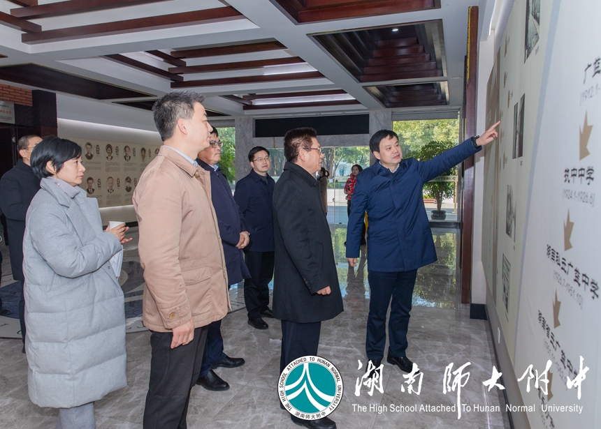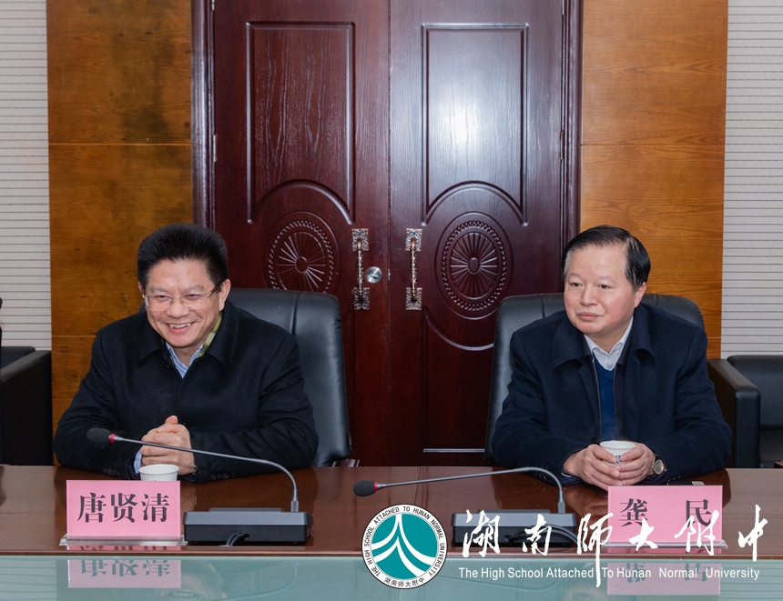 唐贤清参观了校史馆,与我校领导班子成员进行了简短的座谈交流,听取了学校工作情况汇报。他充分肯定了我校近年来取得的成绩,高度评价了附中为湖南师范大学的整体发展做出的突出贡献。他表示,湖南师大将一如既往地支持附中的建设发展,特别是在教学科研、拔尖人才培养等方面加强融合和贯通,共同推进附中研究型卓越高中建设工作。