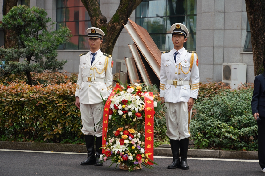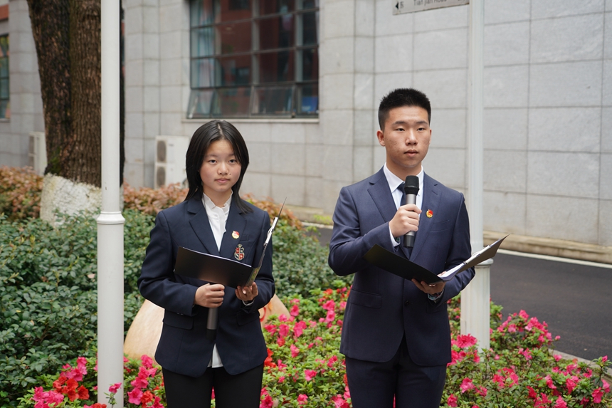英雄已逝,浩气长存。仪仗队队员抬起花篮,正步走向禹之谟先生铜像,将花篮敬献在铜像基座前。随后,谢永红、黄月初缓步上前,在花篮前驻足凝视,仔细整理花篮上的缎带。全体师生神情肃穆,向铜像三鞠躬。团员代表张泽峰颂读祭文,与全体师生共同追忆禹之谟先生的生平事迹,学习先贤精神,表达了对学校创始人贤禹之谟先生的怀念与敬意,表明了同学们谨遵先生教诲、奋力拼搏的决心。最后,师生们依次绕铜像一周,献花致敬。