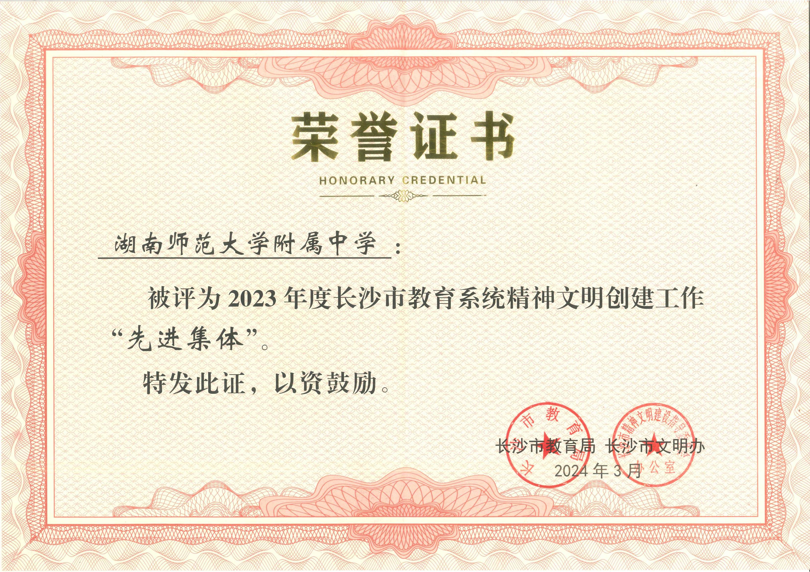 我校荣获2023年度长沙市教育系统精神文明创建工作先进集体