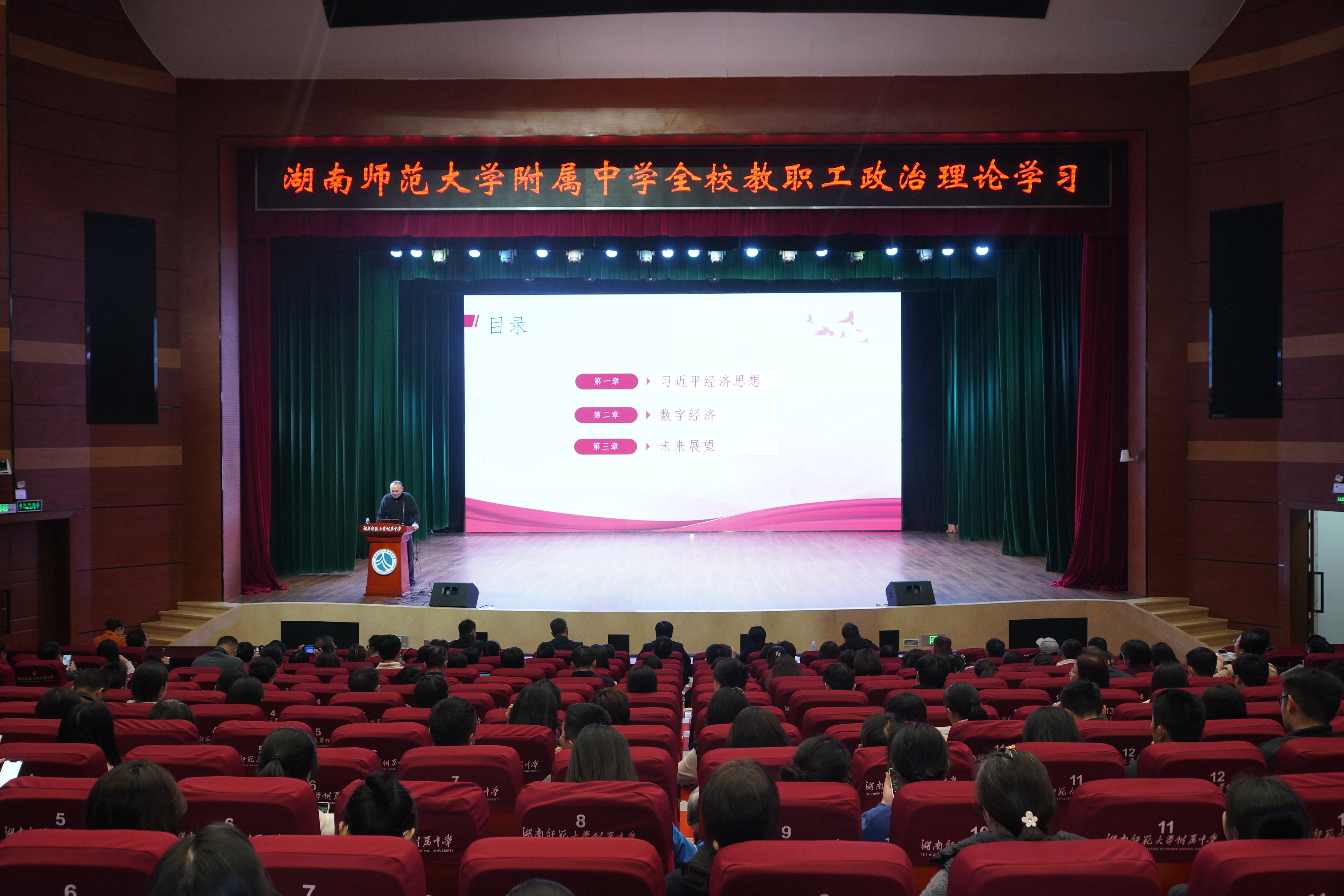 新闻中心 附中新闻 通知公告 最新动态 教育视点 集团学校新闻联播 媒体附中 工作安排 微信附中 学校举行全校教职工政治理论学习 发布:管理员 来源:未知 日期:2025-11-27 人气:分享到: 11月26日,学校举行全校教职工政治理论学习,湖南师范大学商学院副教授阳旸应邀作专题辅导报告。学习由办公室主任吴卿主持。 报告中,阳旸围绕“习近平思想引领中国数字经济高质量发展”这一主题,从数字经济的内涵特征、发展现状和未来路径等方面进行了系统讲解。他阐述了通过数据要素价值释放、数字技术与实体经济深度融合,赋能传统产业转型升级的具体路径。他指出,数字经济正在成为重组全球要素资源、重塑全球经济结构的关键力量。我国数字经济规模已位居世界第二,展现出强劲发展势头。阳旸强调,高质量发展是新时代的硬道理,要不断做强做优做大数字经济。 整场报告内容丰富、重点突出,帮助教职工深化了对数字经济高质量发展战略的理解。大家表示,要将学习成果转化为推动工作的实际成效。 上一篇:“百廿弦歌·锦绣丹青”第40届校园文化艺术节开幕 下一篇:全省第一!我校斩获数奥1国集6金4银1铜 通知公告 更多 关于征集湖南师大附中“十五五” 湖南师大附中2026年教师招聘(第 关于开展2024-2025学年度科研成果评 湖南师大附中2026年教师招聘(第 湖南师大附中2025年教育教学成果 湖南师范大学附属中学2025年零星 最新动态 更多