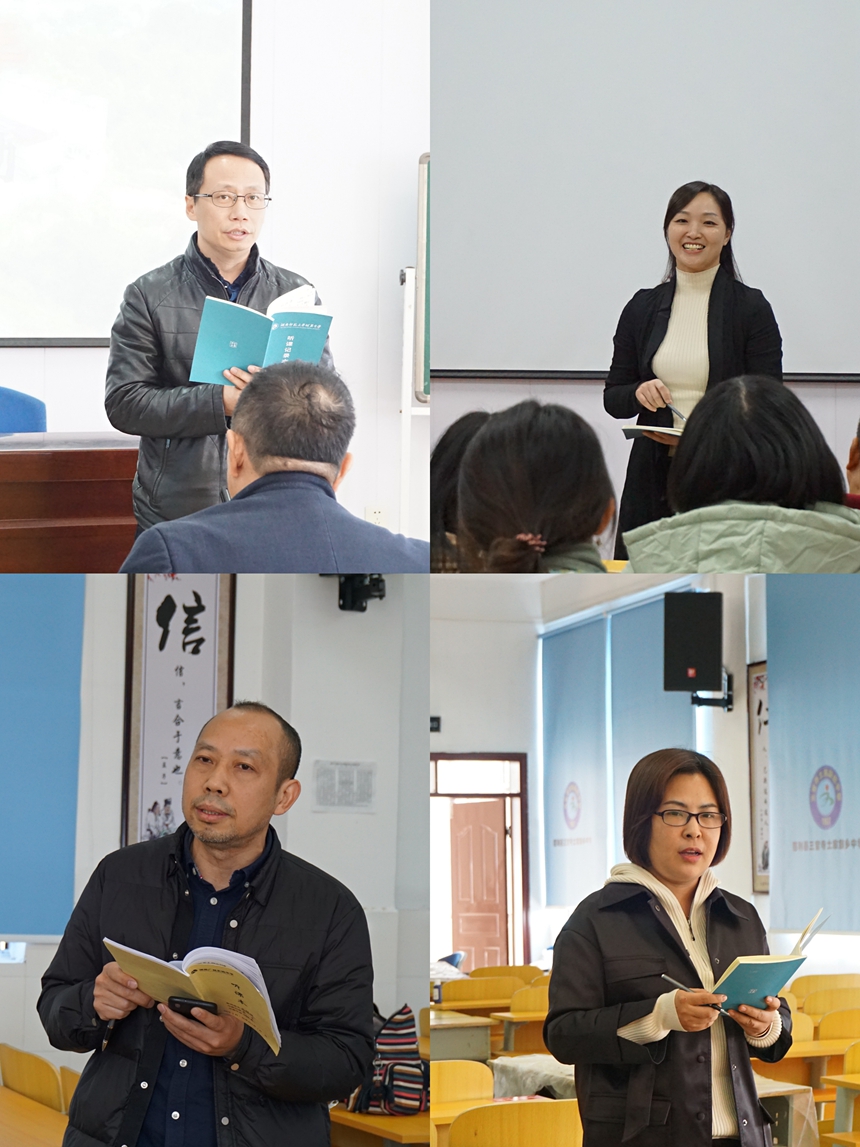 培训围绕“五育并举、融合育人”主题展开。25日上午,湖南师大附中张长鹰老师、张家界民族中学王姣老师、三官寺土家族乡中学蒋冬美老师围绕《遵守规则》课题开展思政课同课异构。课后,三校教师展开了热烈的评课研讨,我校政治教研组组长蒋平波老师作了总结点评和微讲座。黄月初强调了思政课在落实立德树人根本任务中的重要性,阐明了课程育人、教材育人、课堂育人等三个育人理念,分析了课堂教学活跃与理性、形式与内容、传统与现代等三对关系,指出思政教师必须具备思想定力、理论涵养、育人技巧等三种素养。