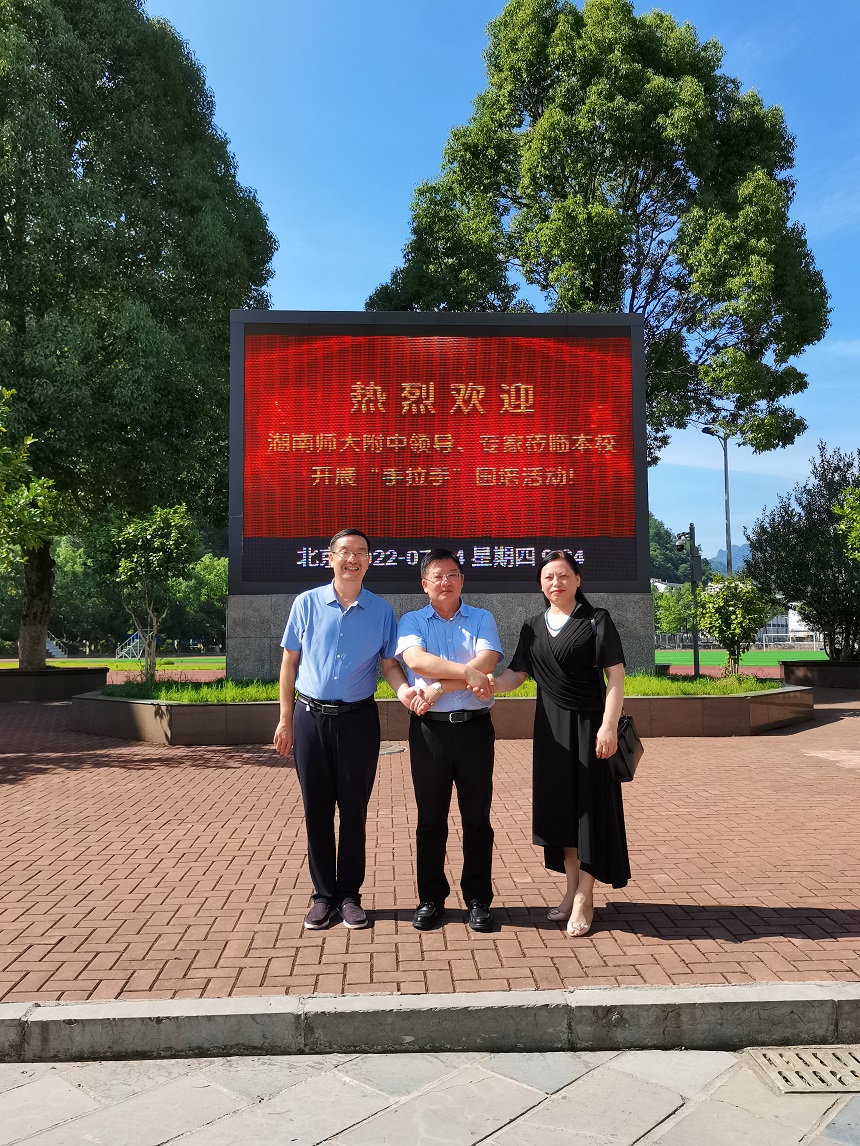 第三站是慈利县三官寺土家族乡中学。该校是我校对口援助学校,也是“手拉手”国培项目服务点。校长李军率班子成员和中层干部接待了我们。黄月初回顾了两校友好交往历程,点赞了2020年、2021年两校“手拉手”国培盛况与丰硕成果,就两校进一步开展互动交流作出了展望并表达了期望。双方研讨了合作领域和交流项目,达成了多方面共识。
