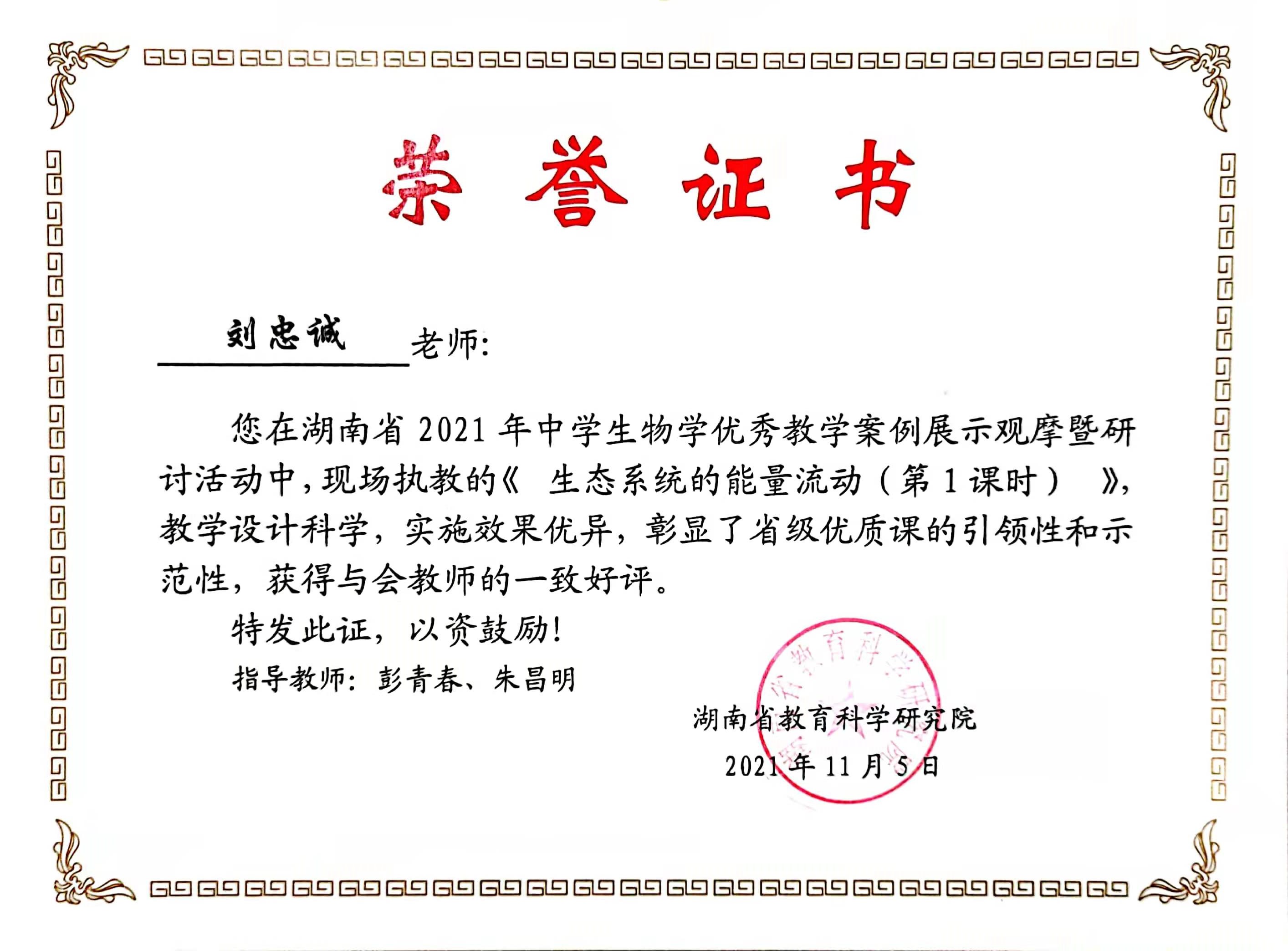 刘忠诚老师参加湖南省高中生物学教学展示获评“优质课”