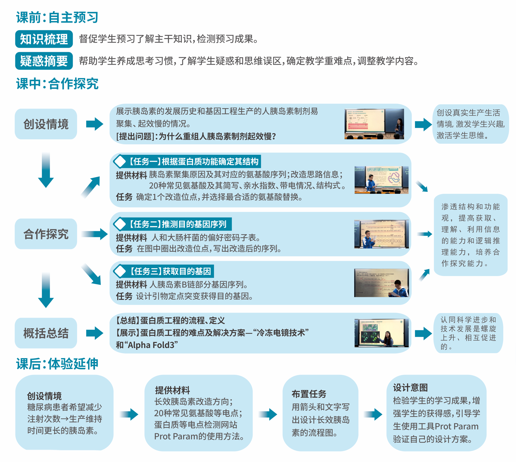 基于“教学评一体化”的“三导四学”课例实践中,课程以胰岛素研发为情境纽带,将生命观念、科学思维、科学探究与社会责任四大核心素养贯穿始终,通过呈现现代生物技术在蛋白质工程领域的实际运用与前沿进展,引导学生体悟科学研究的严谨性与系统性。课堂既夯实知识基础,又以真实情境滋养核心素养,为生物学教学提供了情境化培育素养的范例,助力学生的综合素质提升。