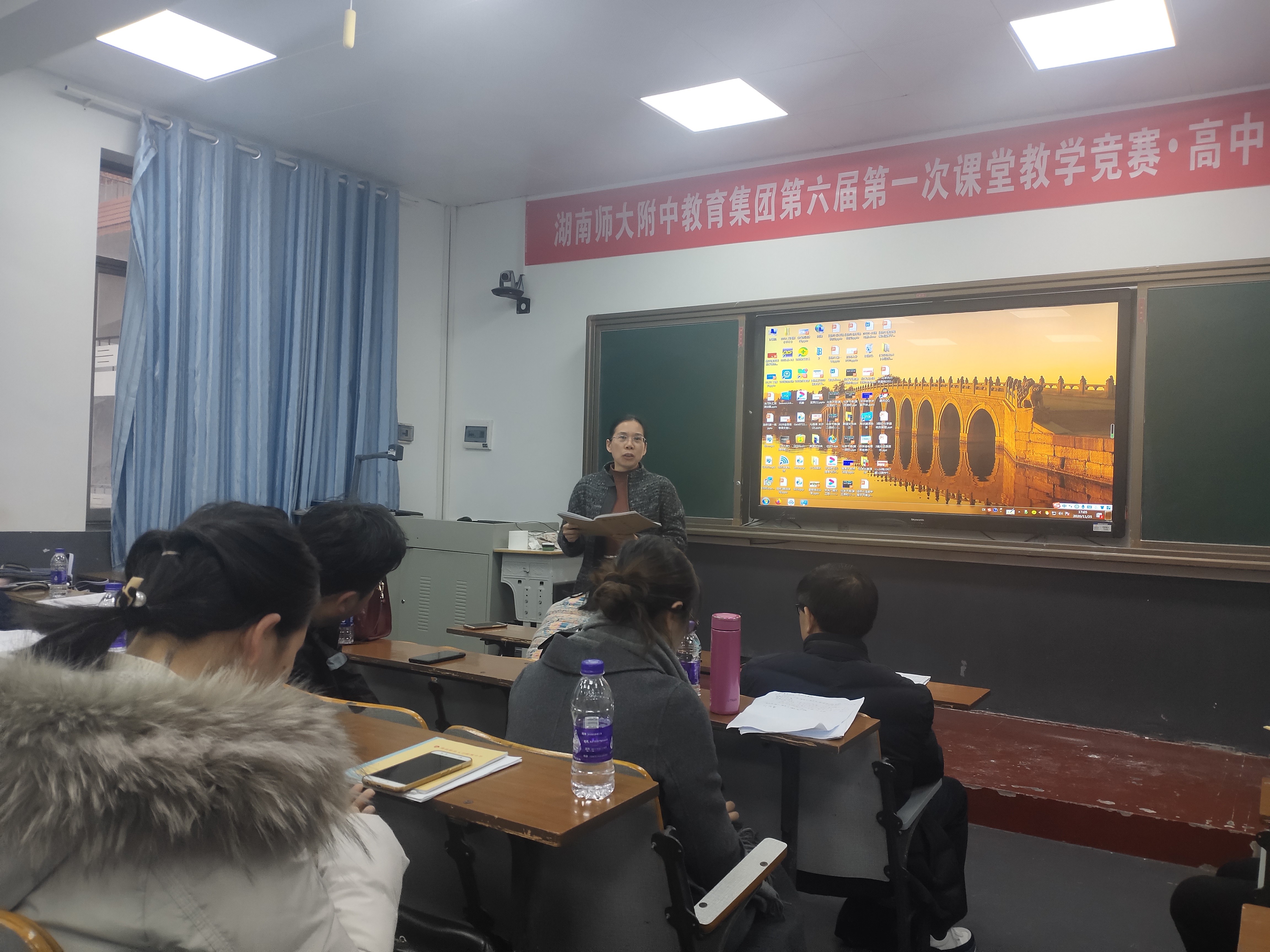 随后,湖师大历文院曹英老师对师大附中指导老师和历文院实习队学生的辛勤付出表达感谢,充分肯定了钟仪璇的个人努力,表扬其教态自然大方,内容丰富多彩,同时建议课堂过渡要更自然,要给学生多一点思考时间。