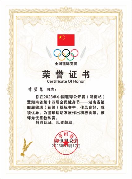 李碧慧老师获评优秀教练员;胡中霖同学获评优秀运动员
