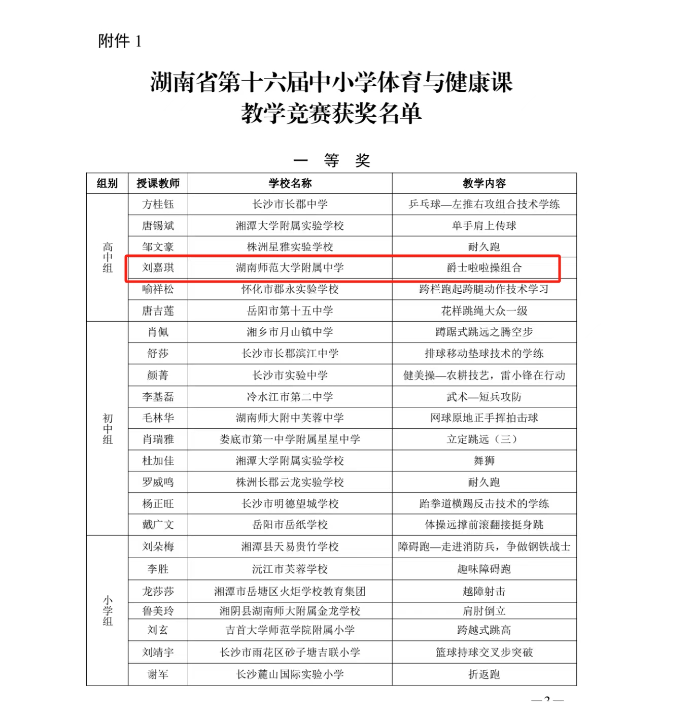 1月23日,湖南省第十六届中小学体育与健康教学竞赛活动已完成第一、第二阶段,14个市州共推荐138节课(高中组31节课、初中组50节课和小学组57节课),经专家评审,我校体育教研组教师刘嘉琪执教的《爵士啦啦操组合》荣获高中组一等奖并将于2024年3月进行现场展示。 特向获奖老师和体育教研组表示祝贺!向全校师生报喜!