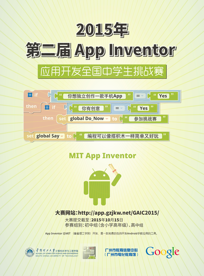 2015年 App Inventor 应用开发全国中学生挑战赛(下称“挑战赛”)旨在培养中学生的计算思维能力,鼓励中学生创新和动手实践。参赛者需在App Inventor(App Inventor由美国麻省理工学院开发,是一款免费的在线开发Android应用的工具)平台上开发Android应用程序。评委将根据本挑战赛规则选出获奖作品。以下是完整的详细信息