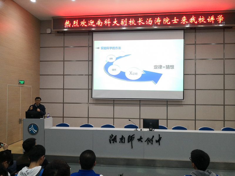 课程建设 教学资讯 课堂教学 学科竞赛 作业公示 校本课程 高考专栏 惟一论坛第107期教你《如何成为一名科学家》 发布:课程与教学处 来源:未知 日期:2019-03-08 人气:分享到: 2019年3月8日中午惟一论坛第107期在科学楼二楼会议厅开讲。本次论坛我们有幸邀请到南方科技大学副校长、中国科学院院士汤涛教授为高一年级学生讲授《如何成为一名科学家》。南方科技大学招生办副主任谭建伟教授、我校校长助理苏建祥、课程与教学处主任黄宇鸿参加了本次论坛活动。 汤涛院士根据自身在数学领域数十载的研究经历,为同学们的高中、大学规划提出了建议。他告诉同学们,中学阶段要培养观察、思考和表达能力,学好数学尤为重要;也从张益唐博士蛰伏三十载、历经漂泊艰辛但仍静心专注科学终获突破和英国数学家怀尔斯独自潜心研究数载证明出费马大定理的生动事例,掲示了成为一名科学家所必备的个人素养;并以此鼓励高一学生要厚积薄发、要立志、坚持、动脑、耐住寂寞,活出零零后的精彩! 最后汤院士接受了学生的现场提问,为高一学生提前做好人生规划指明了方向。 主讲人介绍 汤涛,南方科技大学副校长兼教务长,理学博士,中国科学院院士,长江学者讲座教授,美国工业与应用数学学会会士(SIAM Fellow),美国数学会会士(AMS Fellow)。1984年取得北京大学数学学士学位;1989年获英国利兹大学应用数学博士学位;1990年至1998年执教于加拿大西门菲莎大学,取得终身教职;1998年加入香港浸会大学,2003年任数学讲座教授。获得冯康科学计算奖、杰出青年基金、国家自然科学二等奖。曾任香港浸会大学数学系系主任、研究生院院长、协理副校长、理学院院长。2015年5月受聘为南方科技大学副校长、数学系讲席教授。 上一篇:我校举行“迎元旦,猜灯谜”活动 下一篇:我校高三二轮复习示范课活动圆满结束 通知公告 更多 关于做好2025年事业单位工作人员 湖南省教育科学规划办《关于做好 关于做好2025年度全国教育科学规 五一假期安全提醒 2025年劳动节放假通知 关于做好政工专业知识考试工作的 最新动态 更多