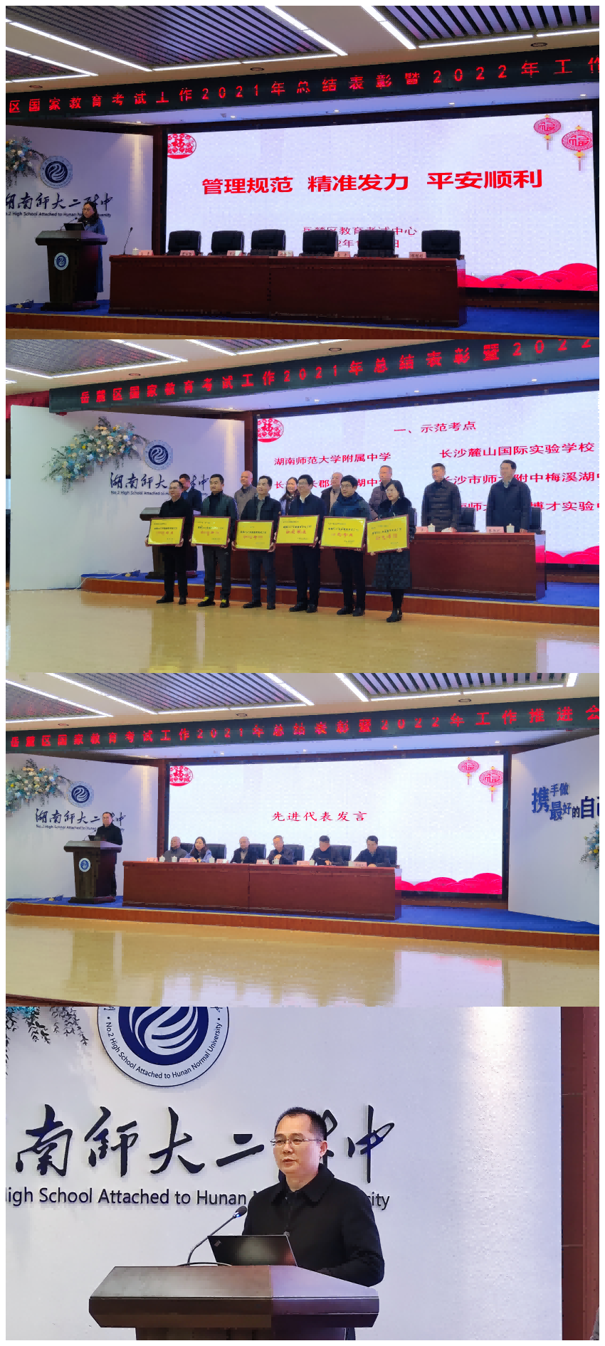课程建设 教学资讯 课堂教学 学科竞赛 作业公示 校本课程 高考专栏 我校荣获岳麓区2021年度教育考试工作示范考点荣誉称号 发布:熊健 来源:课程与教学处 日期:2022-06-16 人气:分享到: 2022年1月10日,在湖南师范大学第二附属中学举行的岳麓区国家教育考试工作2021年度总结表彰暨2022年工作推进会上,我校荣获岳麓区2021年度教育考试工作“示范考点”荣誉称号,课程与教学处主任黄宇鸿荣获长沙市教育考试工作先进个人,课程与教学处副主任李勇荣获岳麓区教育考试工作先进个人,熊健等两位老师荣获岳麓区报名工作先进个人。黄宇鸿主任作为先进代表在会上分享了我校国家考试组考经验。 我校每年都承担了多项国家教育考试的组考工作,始终把关爱考生、科学规范、狠抓细节、杜绝差错作为考务工作的指导思想,优良的工作作风赢得了省、市、区招考部门和社会各界的高度赞誉。 (撰稿人:熊健 审稿人:黄宇鸿) 上一篇:我校举行哈尔滨工业大学机器人与人工智能青少年人才培养基地授牌仪式 下一篇:湖南省沅江市第一中学来我校交流考察 通知公告 更多 湖南师范大学附属中学2025年公开 湖南省教育厅关于做好湖南省教育 关于举办第二十二届学生社团节的 2025多伦多学士嘉堡校区夏校宣讲 湖南师范大学附属中学2025年公开 湖南师大附中2024-2025学年度第二学 最新动态 更多