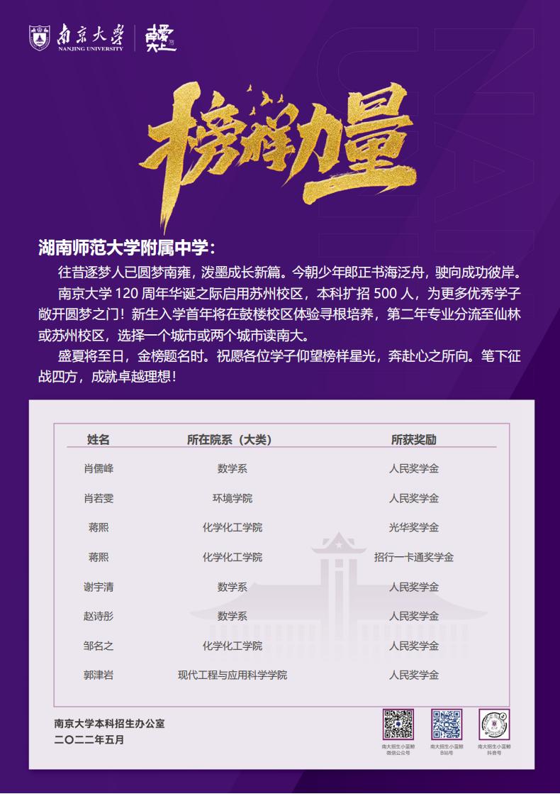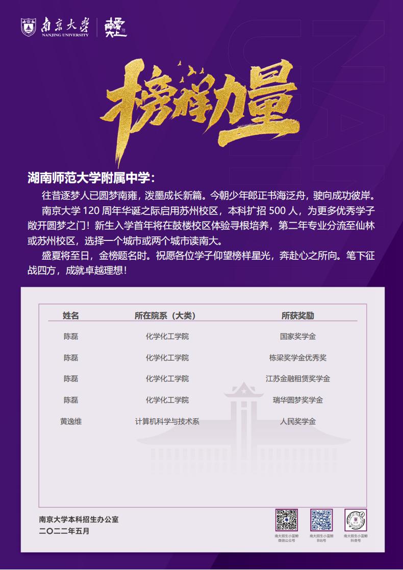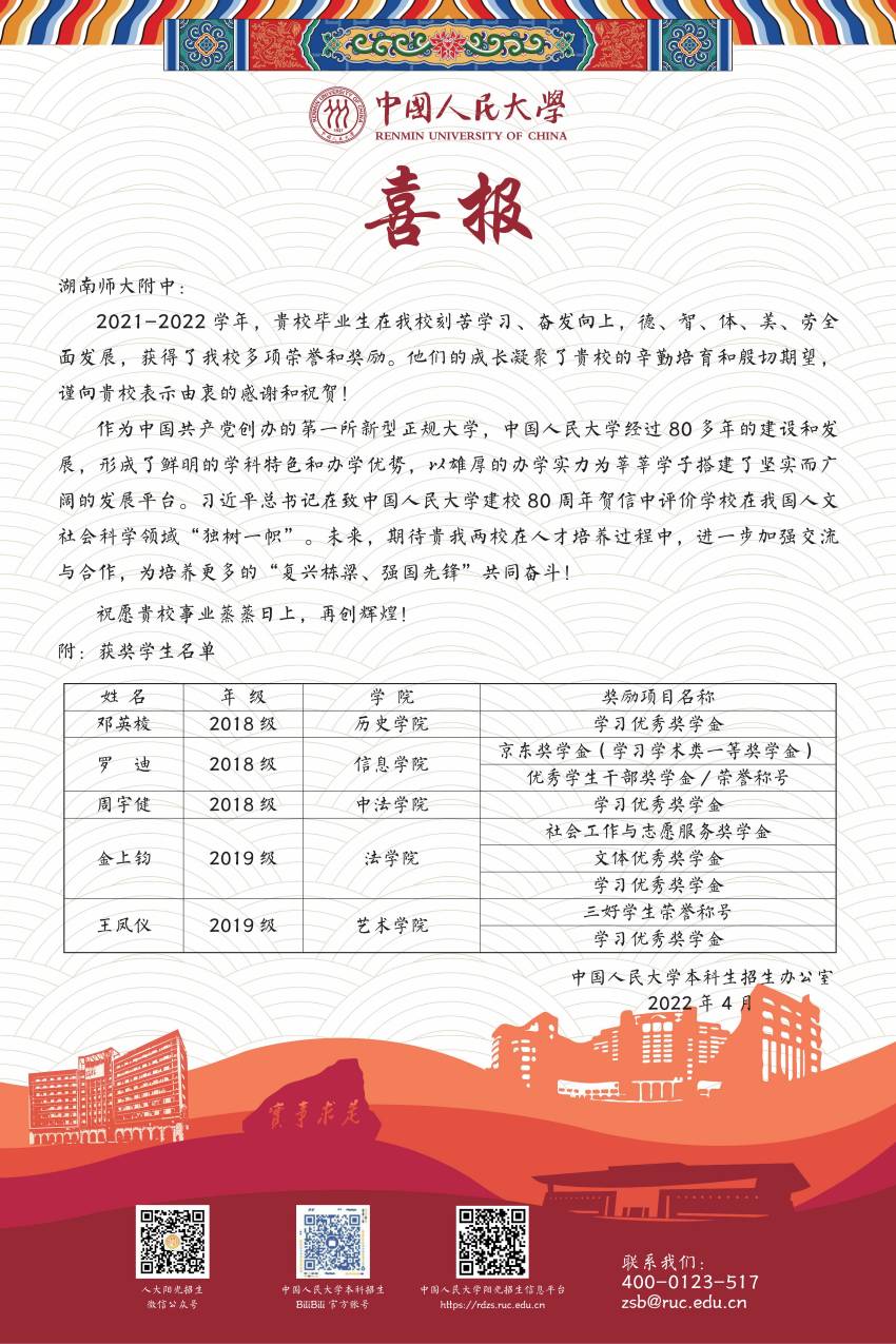 课程建设 教学资讯 课堂教学 学科竞赛 作业公示 校本课程 高考专栏 喜报:我校优秀毕业生再获高校多项荣誉 发布:熊健 来源:课程与教学处 日期:2022-05-08 人气:分享到: 2021-2022学年,我校优秀毕业生在大学刻苦学习、奋发向上,德、智、体、美、劳全面发展,获得多项荣誉和奖励。希望广大同学以师兄师姐为榜样,努力拼搏、奋发进取,争取考入心仪的大学,为中华民族伟大的复兴之路贡献自己的力量。 附:获奖学生名单 上一篇:学校进行2021级高一年级研究性学习课题组长专题培训 下一篇:我校召开21-22学年度第二学期教育教学半期工作总结会议 通知公告 更多 关于做好2025年事业单位工作人员 湖南省教育科学规划办《关于做好 关于做好2025年度全国教育科学规 五一假期安全提醒 2025年劳动节放假通知 关于做好政工专业知识考试工作的 最新动态 更多