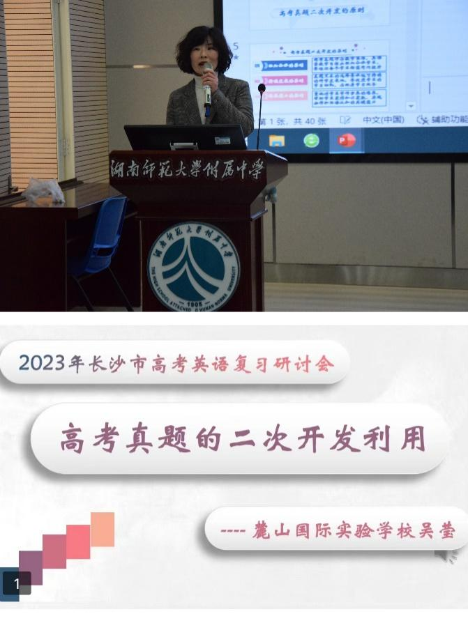 来自麓山国际实验学校的吴莹老师进行了以“二轮复习中高考真题的二次开发和利用”为题的讲座。吴老师从高考真题二次开发的原则、意义、实质和实践出发,鼓励各位同仁积极探索和尝试,注重培养学生的能力和素质,不断创新教育教学方法,以更好地适应时代的变化和教育的需求。