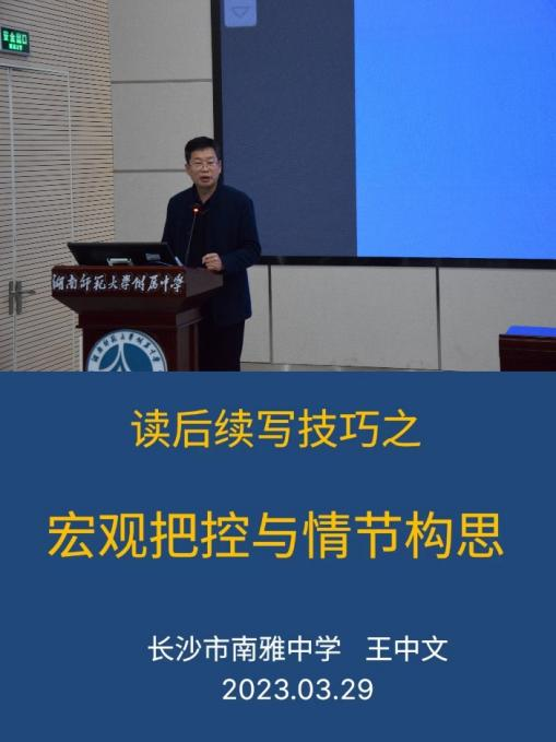 南雅中学王中文老师随后展开以“读后续写技巧之宏观把控情节构思”为主题的讲座。王老师结合自身最近两年的教学实践,摸索出了以下续写指导策略与各位一线教师分享:重温作者“初心”、树立全文整体观、学会“剧情反转”、始终保持好奇之心、适时进行“无缝对接”。这些策略极具启发性和实用性,有利于教师高效指导学生合理构思续写情节。