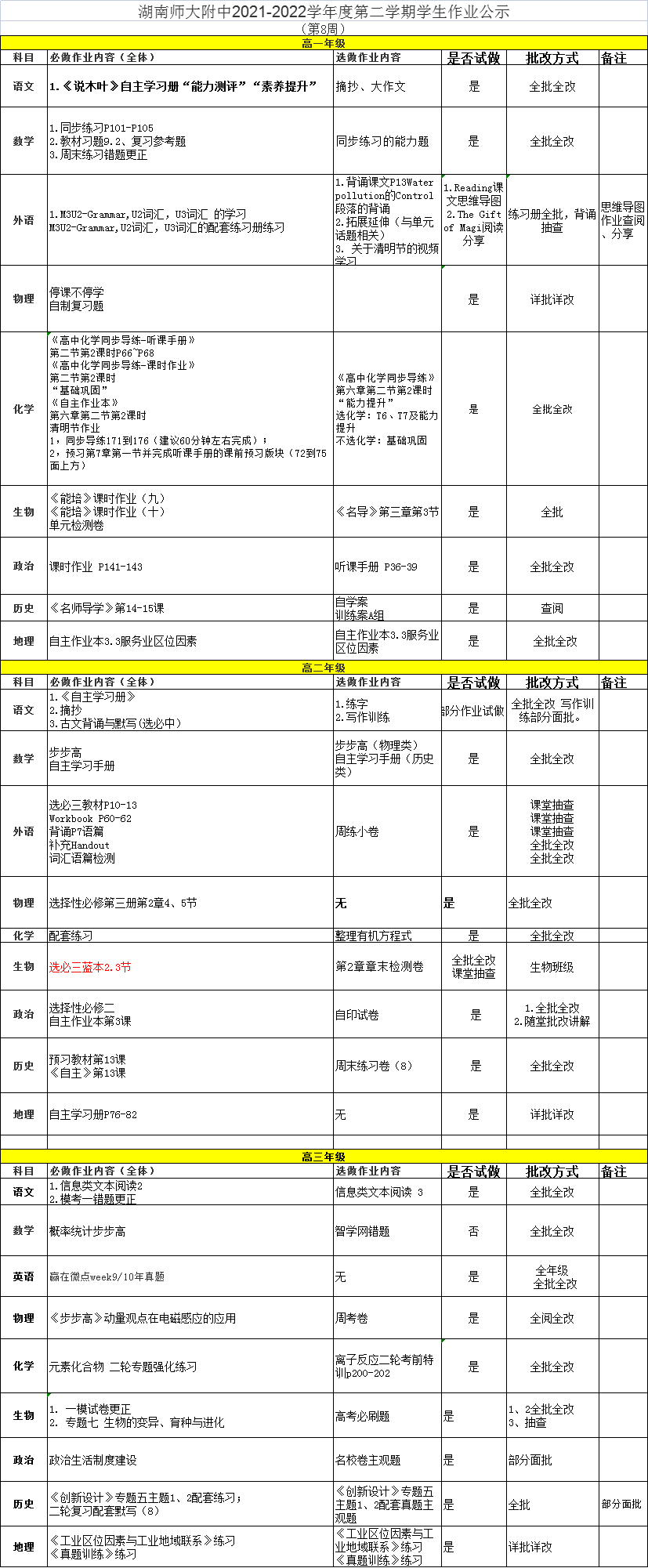 课程建设 教学资讯 课堂教学 学科竞赛 作业公示 校本课程 高考专栏 21-22-2作业公示08 发布:教学与课程处 来源:课程与教学处 日期:2022-04-06 人气:分享到: 上一篇:21-22-2作业公示07 下一篇:21-22-2作业公示09 通知公告 更多 2025年劳动节放假通知 关于做好政工专业知识考试工作的 2026年多伦多大学士嘉堡校区绿色 2025年清明节放假通知 湖南师范大学附属中学2025年公开 湖南省教育厅关于做好湖南省教育 最新动态 更多