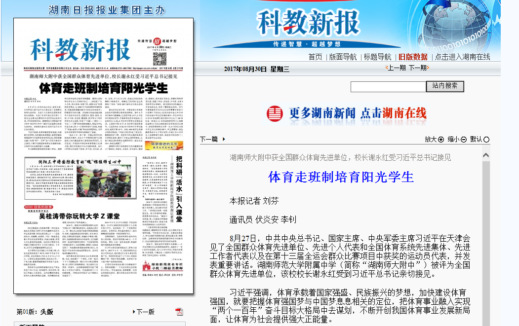 本报记者 刘芬 通讯员 伏炎安 李钊 8月27日,中共中央总书记、国家主席、中央军委主席习近平在天津会见了全国群众体育先进单位、先进个人代表和全国体育系统先进集体、先进工作者代表以及在第十三届全运会群众比赛项目中获奖的运动员代表,并发表重要讲话。湖南师范大学附属中学(简称“湖南师大附中”)被评为全国群众体育先进单位,该校校长谢永红受到习近平总书记亲切接见。 习近平强调,体育承载着国家强盛、民族振兴的梦想,加快建设体育强国,就要把握体育强国梦与中国梦息息相关的定位,把体育事业融入实现“两个一百年”奋斗目标大格局中去谋划,不断开创我国体育事业发展新局面,让体育为社会提供强大正能量。 作为湖南省素质教育的窗口学校,湖南师大附中始终以培养身体健康、懂得生活的阳光学生为人才培养目标之一。该校基于“以人为本,承认差异,发展个性,着眼未来”的课程改革理念,从2000年开始探索体育课程改革,实施选修课模块教学(俗称走班制教学),即根据学生的兴趣、学校教学场地设施及教学人员的专业状况,设置田径、篮球、排球、足球、乒乓球、羽毛球、健美操、武术等8个项目供学生自主选修,形成了“兴趣——爱好——专长——习惯”的体育教育模式,使每名学生有适合自己的1—2项体育爱好与技能,构建了“体能+素质+兴趣”特长的课程特色,为学生终身体育和可持续发展奠定了基础。 “高中3年,除了第一学期必修田径和校园武术操外,其余5个学期我们都可以根据自己的兴趣选择自己喜爱的体育项目,尤其是高三年级很多学校体育课都被文化课占据,我们学校依旧开足开满体育课。高中3年我先后选修了排球、乒乓球、羽毛球、武术、足球,学习压力大时,我就会到校园的樟树下练练武术,缓解压力的同时也让我锻炼了身体。”该校2017届毕业生杨志远如是说。 谢永红向记者介绍,目前该校已形成常态化的专项性群众体育活动特色。每年4月举行春季马路赛跑,已连续开展10年;5月份举行校园社团节,开展体育社团专项活动,已连续举办14届;8月份举行军营生活体验活动,已连续开展32年;9月份举行校园体育节,已连续举办32届;10月份举行冬季长跑活动,连续开展10年。该校1605班学生禹湘以前体质较弱,“学校让我们形成了爱运动、勤锻炼的好习惯。学校有不同主题的体育项目供我们选择,激发了大家运动的积极性,以前不爱运动的我现在也跟同学们一起乐在运动中,体质也增强了。” 湖南师大附中还依据学生的兴趣爱好成立了篮球社、排球社、足球社、羽毛球社、棒球社、围棋社、武术爱好者协会、街舞社等体育类社团,创建了田径、羽毛球、乒乓球、足球4支体育专业训练队,曾为国家田径队输送人才参加亚运会,培养了健将级运动员。仅今年暑假就有多名学生在各种赛事中斩获不少奖牌:7月份在山东省济南市章丘中学举行的全国中学生田径锦标赛中,学生李丹以11秒67的成绩打破全国中学生女子100米纪录,陈龙以2.1米的成绩获得男子乙组跳高金牌;8月份在湖南省田径传统项目比赛中,该校获得团体总分第一名;8月份在全国中学生羽毛球锦标赛中,学生谭雁缤、曾佳鑫获得高中女子双打冠军;目前已有4名学生入选湖南省代表队,将赴杭州参加第十三届全国学生运动会。 |