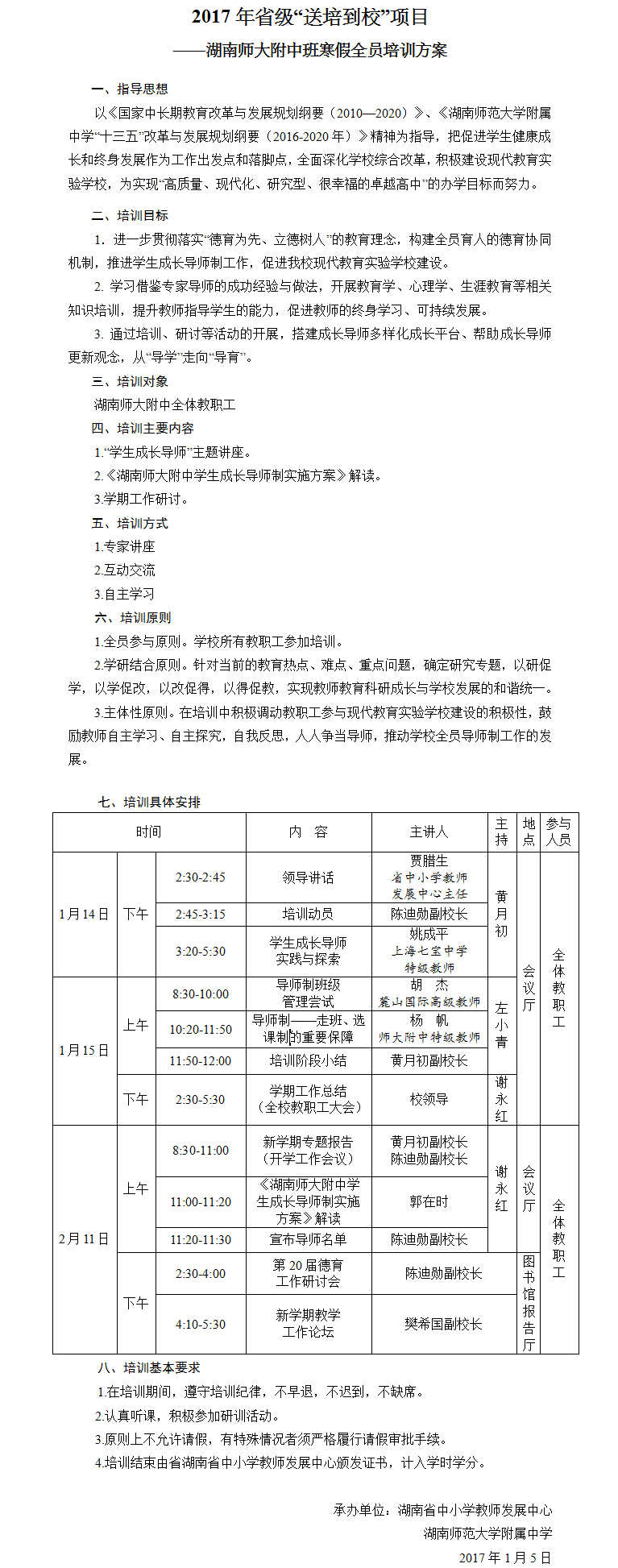 新闻中心 附中新闻 通知公告 最新动态 教育视点 集团学校新闻联播 媒体聚焦 工作安排 微信附中 湖南师大附中寒假全员培训方案 发布:学校办公室 来源:未知 日期:2017-01-13 人气:分享到: 上一篇:2016年下学期期末、寒假及新学期开学主要工作安排 下一篇:2017年寒假行政、网络、总务值班安排 通知公告 更多 湖南师范大学附属中学食堂物资供 湖南师范大学附属中学2024年门面 2024年湖南师大附中桐梓实验中学 湖南师范大学附属中学2024年公开 湖南师范大学附属中学化学实验室 湖南师范大学附属中学2024级七年 最新动态 更多