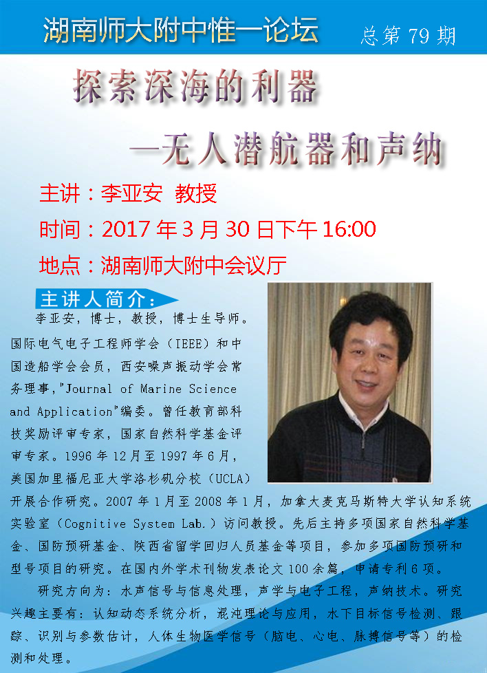 新闻中心 附中新闻 通知公告 最新动态 教育视点 集团学校新闻联播 媒体附中 工作安排 微信附中 惟一论坛第79期:探索深海的利器—无人潜航器和声纳 发布:教学与课程处 来源:未知 日期:2017-03-29 人气:分享到: 上一篇:加拿大文思博学校2017-2019年度“湖南学者”全额奖学金选拔测试通知 下一篇:教学开放日活动安排表 (16-17学年第二学期) 通知公告 更多 湖南师范大学附属中学2025年第二 湖南师范大学附属中学2025年第二 湖南师范大学附属中学2025年第二 湘人社办函〔2025〕46号计算机应用 中国教育发展战略学会教育评价专 湖南师范大学附属中学2025年招聘 最新动态 更多