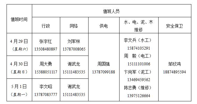 附2017年劳动节行政、网络、总务及安全保卫值班人员安排表:
