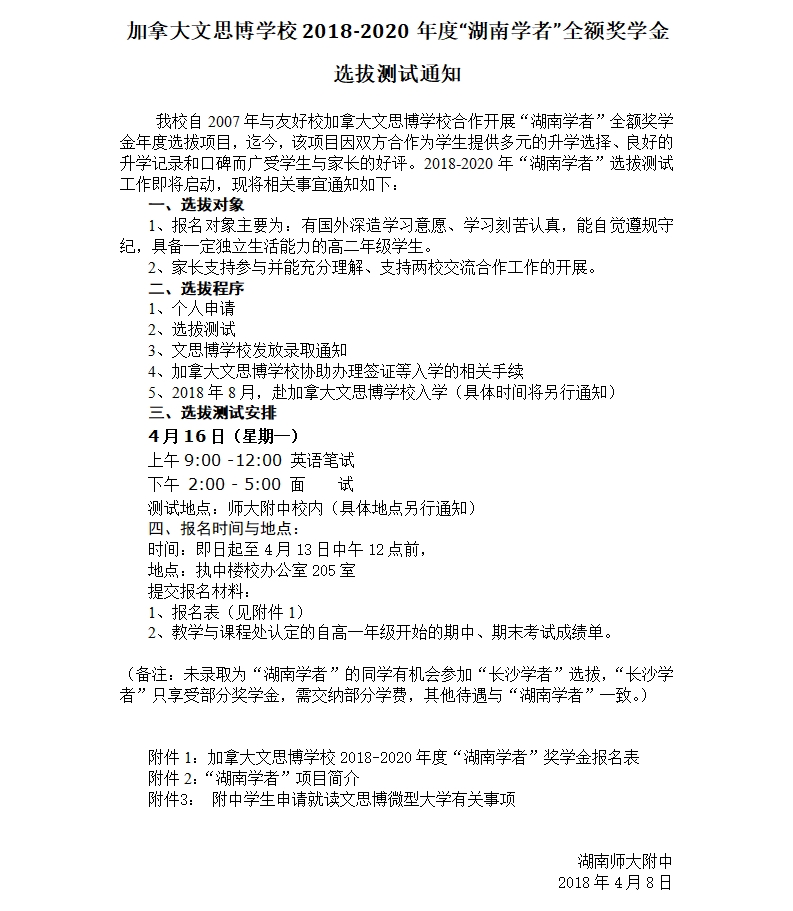 新闻中心 附中新闻 通知公告 最新动态 教育视点 集团学校新闻联播 媒体聚焦 工作安排 微信附中 加拿大文思博学校2018-2020年度“湖南学者”全额奖学金选拔测试通知 发布:系统管理员 来源:未知 日期:2018-04-09 人气:分享到: 附件1.湖南学者选拔测试报名表 附件2.湖南学者项目简介 附件3.附中学生申请就读文思博学校有关事项说明 上一篇:加拿大多伦多大学2018年“绿色通道”项目招生宣讲会通知 下一篇:会议通知 通知公告 更多 湖南师范大学附属中学食堂物资供 湖南师范大学附属中学2024年门面 2024年湖南师大附中桐梓实验中学 湖南师范大学附属中学2024年公开 湖南师范大学附属中学化学实验室 湖南师范大学附属中学2024级七年 最新动态 更多