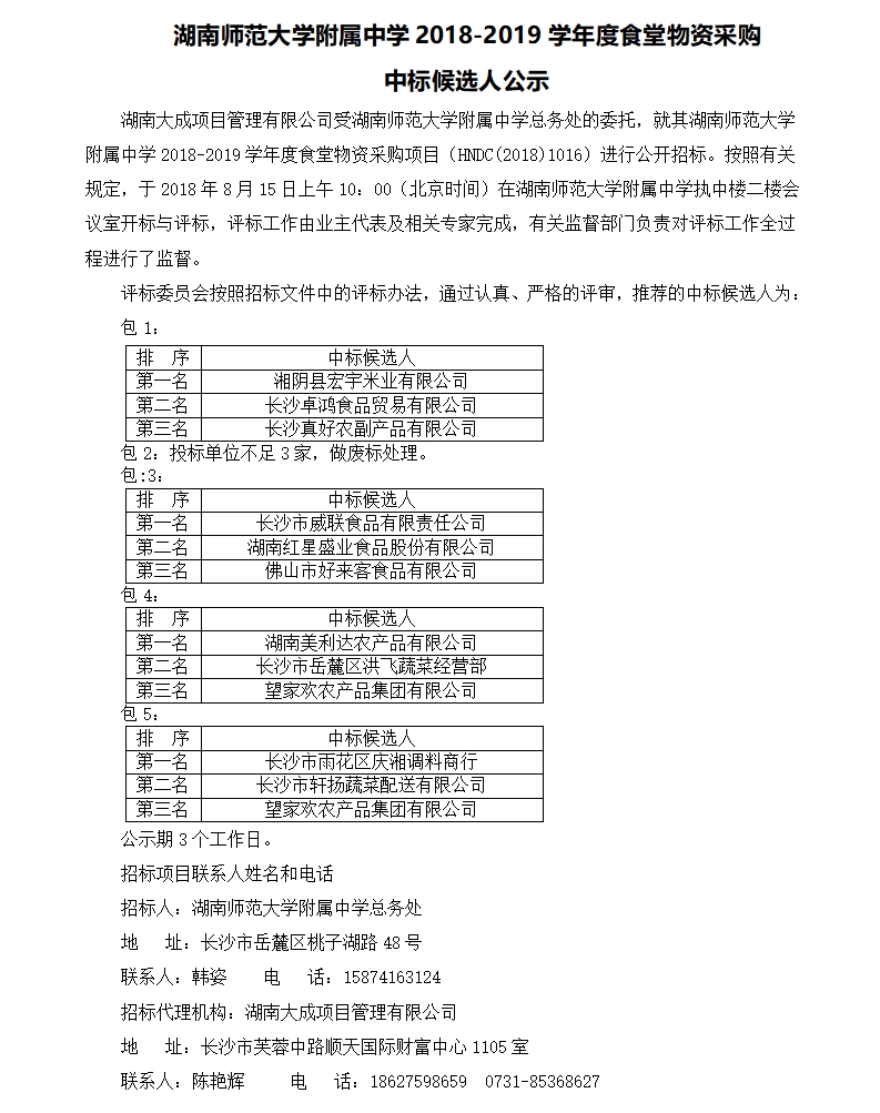 新闻中心 附中新闻 通知公告 最新动态 教育视点 集团学校新闻联播 媒体聚焦 工作安排 微信附中 湖南师范大学附属中学2018-2019学年度食堂物资采购中标候选人公示 发布:系统管理员 来源:未知 日期:2018-08-21 人气:分享到: 上一篇:湖南师大附中食堂蒸汽管道改造工程进行竞争性磋商采购公告 下一篇:湖南师大附中田径场广播系统建设项目招标公告 通知公告 更多 关于做好2025年事业单位工作人员 湖南省教育科学规划办《关于做好 关于做好2025年度全国教育科学规 五一假期安全提醒 2025年劳动节放假通知 关于做好政工专业知识考试工作的 最新动态 更多