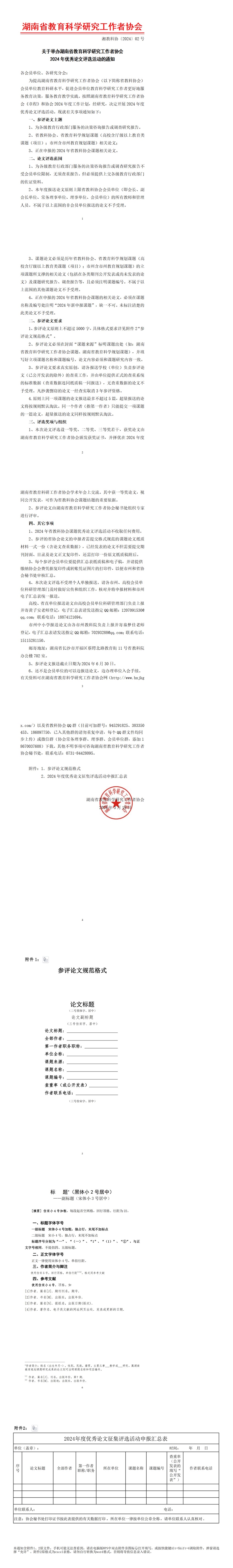 新闻中心 附中新闻 通知公告 最新动态 教育视点 集团学校新闻联播 媒体聚焦 工作安排 微信附中 关于举办湖南省教育科学研究工作者协会2024年优秀论文评选活动的通知 发布:系统管理员 来源:未知 日期:2024-03-19 人气:分享到: 附件1:参评论文规范格式 上一篇:关于开展第二届湖南省基础教育教学改革项目申报工作的通知 下一篇:关于推荐2024年享受国务院政府特殊津贴人选的通知 通知公告 更多 关于做好2025年事业单位工作人员 湖南省教育科学规划办《关于做好 关于做好2025年度全国教育科学规 五一假期安全提醒 2025年劳动节放假通知 关于做好政工专业知识考试工作的 最新动态 更多
