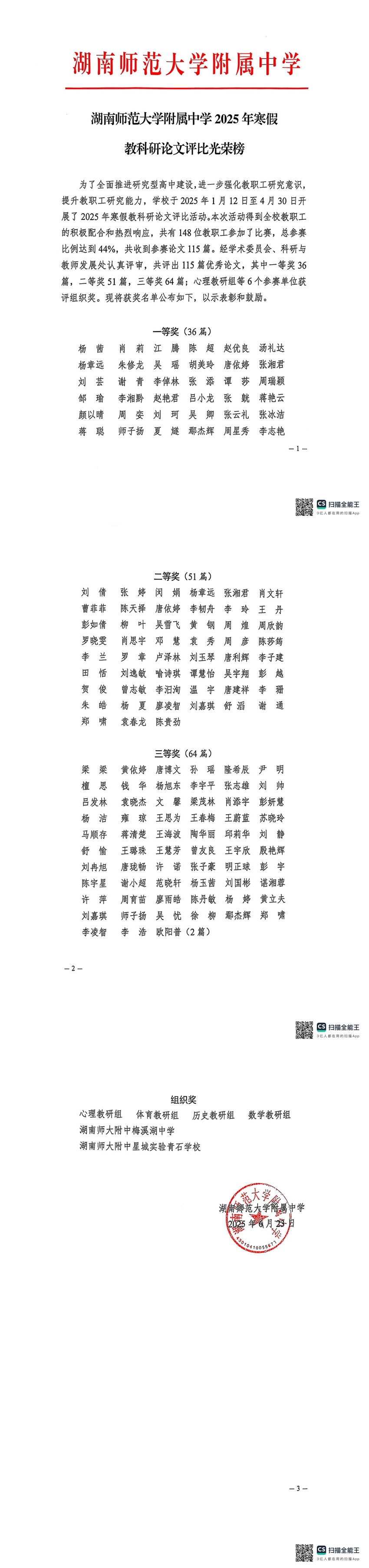 新闻中心 附中新闻 通知公告 最新动态 教育视点 集团学校新闻联播 媒体附中 工作安排 微信附中 湖南师范大学附属中学2025年寒假教科研论文评比光荣榜 发布:系统管理员 来源:未知 日期:2025-06-23 人气:分享到: 上一篇:湖南师大附中2025年度中小学正高级教师职称和副高级、中级教师职称评审推荐工作方案 下一篇:2025年国庆节、中秋节放假通知 通知公告 更多 2025年国庆节、中秋节放假通知 湖南师大附中2025年度中小学正高 2026年多伦多大学士嘉堡校区绿色 湖南师大附中教育基金会招聘公告 湖南师范大学附属中学2025年第二 湖南师范大学附属中学2025年教师 最新动态 更多