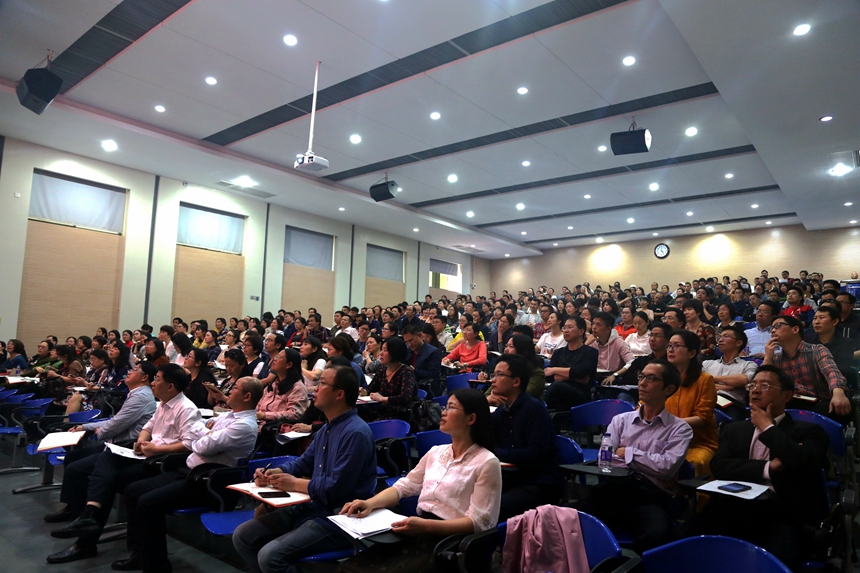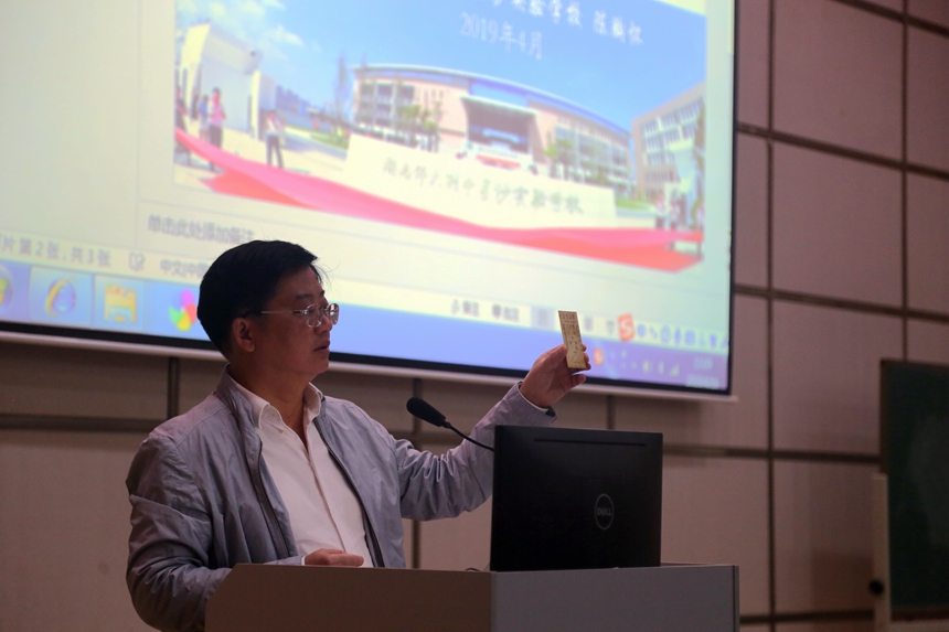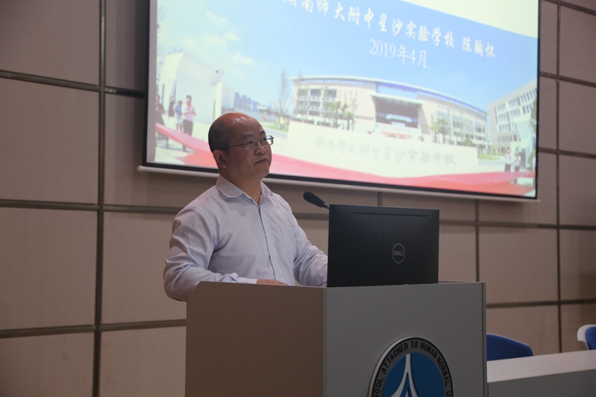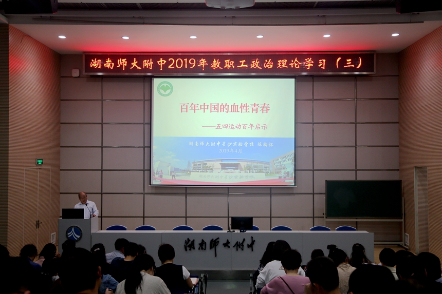 首先,校长助理、附中星沙实验学校校长陈胸怀作《百年中国的血性青春——五四运动百年启示》专题报告。他以影片《建党伟业》的镜头切入,将全体与会教师带回到“五四运动”前夕热血澎湃的岁月。在“五四”青年们不屈不挠、义无反顾的奋斗中,“唯有趋势不可战胜,唯有青年战无不胜”的力量令人震撼!他呼吁老师们继承和发扬“五四精神”,为创造附中的美好明天而不懈努力。