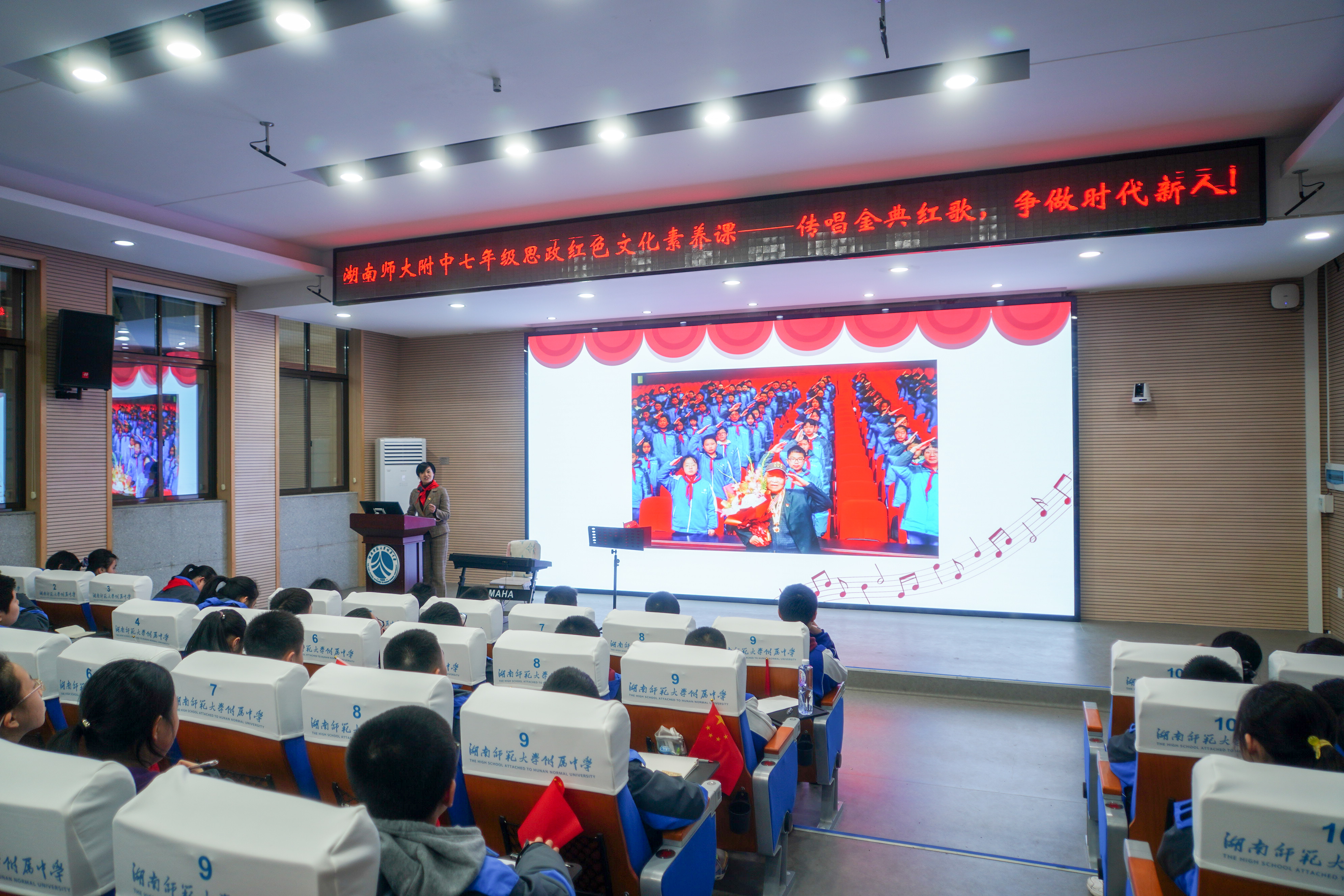 3月9日,学校之谟图书馆会议厅里余音袅袅,激情洋溢,纪检书记李春莲老师为七年级的孩子们带来一堂名为“传唱红色经典,争做时代新人”的思政课。