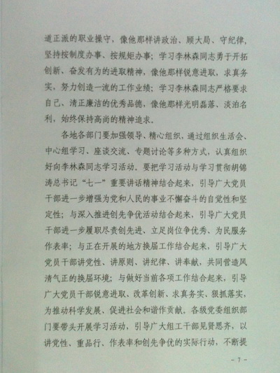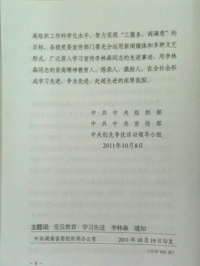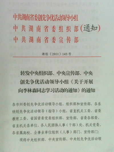 根据上级组织要求,现将中共中央组织部、中共中央宣传部、中央创先争优活动领导小组《关于开展向李林森同志学习活动的通知》(组通字﹝2011﹞47号)和湖南省委组织部、湖南省委宣传部、湖南省委创先争优活动领导小组《转发中央组织部、中央宣传部、中央创先争优活动领导小组<关于开展向李林森同志学习活动的通知>的通知》转发,请各支部结合实际认真组织贯彻落实。