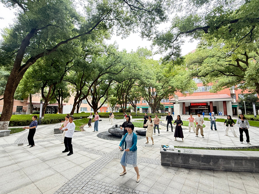 “两手托天理三焦,左右开弓似射雕……”老师们动作整齐划一,舒展大方,在一招一式中放松肩颈、调理气息,有效缓解了因久站、久坐带来的疲劳。活动发起方校工会介绍,自启动以来,该活动受到了老师们的热烈欢迎,每天都能吸引超过30名老师主动前来“打卡”锻炼,已成为校园里一项充满正能量的新传统。