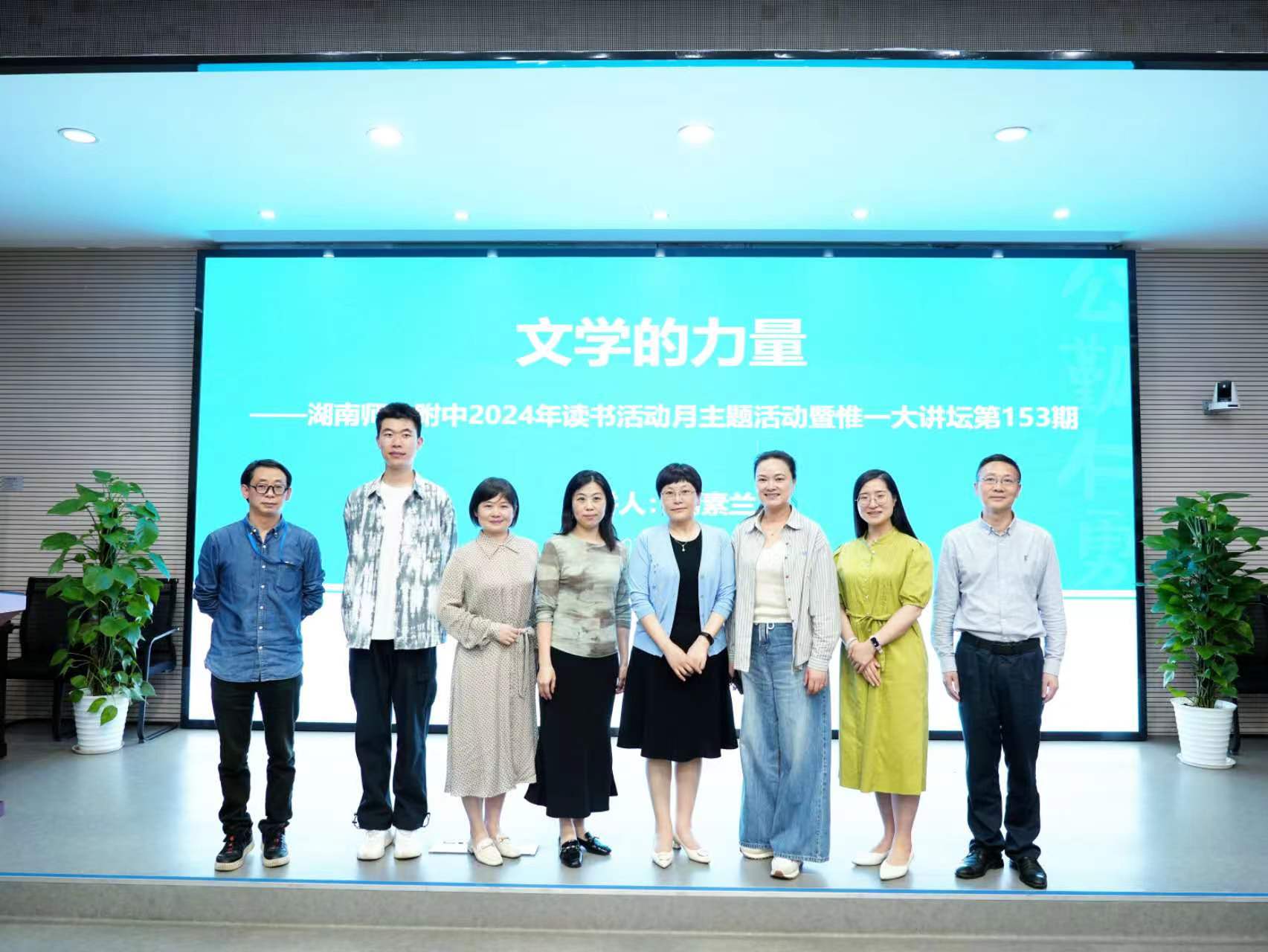 岳麓山下好读书,湘江之畔书香浓。4月24晚7:00,我校2024年读书活动月主题活动、惟一大讲坛第153期讲座在学校之谟图书馆报告厅举行,本次活动由之谟图书馆、之谟教师研究院、语文教研组和湖南师大附中“玫瑰书香”女职工读书会共同组织。湖南省文联副主席、湖南师范大学文学院汤素兰教授莅临我校作《文学的力量》专题报告,学校工会副主席谭伟老师带领我校“玫瑰书香”女职工读书会和部分工会委员、教职工代表等参加活动。活动由校办公室副主任欧阳荐枫老师主持。