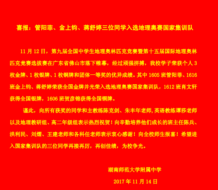 喜报:管阳菲、金上钧、蒋舒婷三位同学入选地理奥赛国家集训队