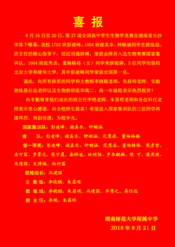 喜报:我校彭凌峰、谢真乐、钟砺涵同学入选2018年全国中学生生物奥赛国家集训队