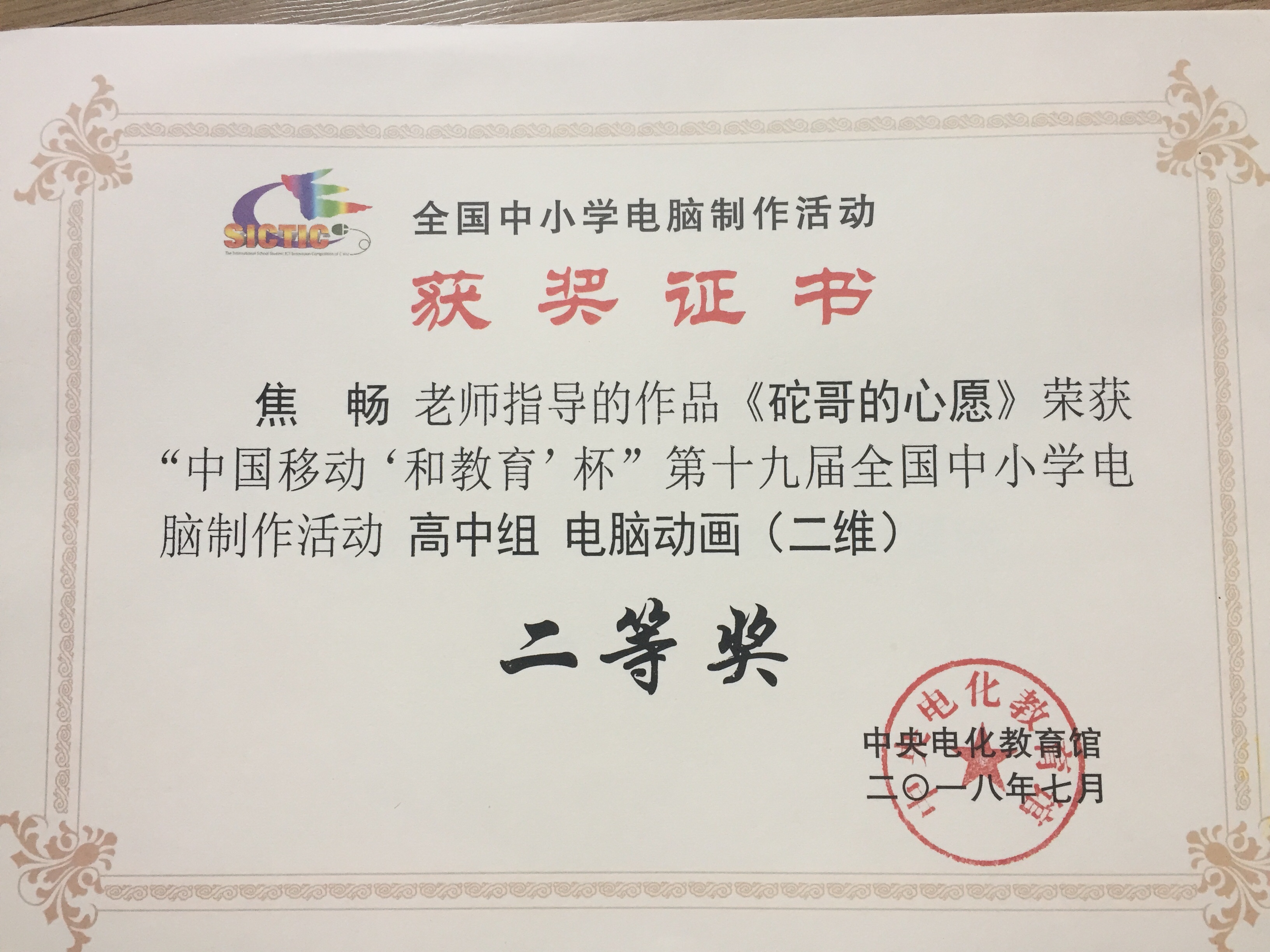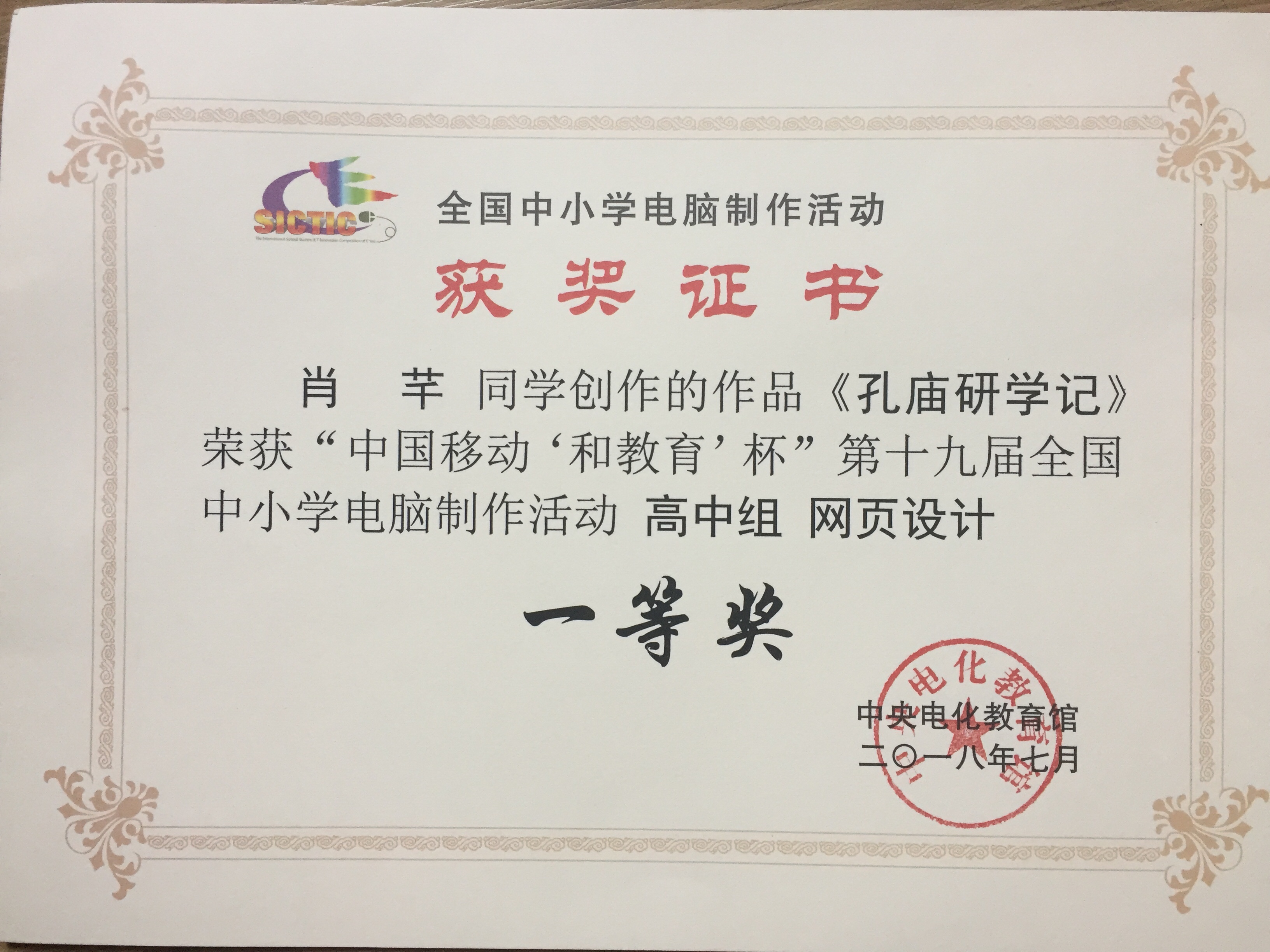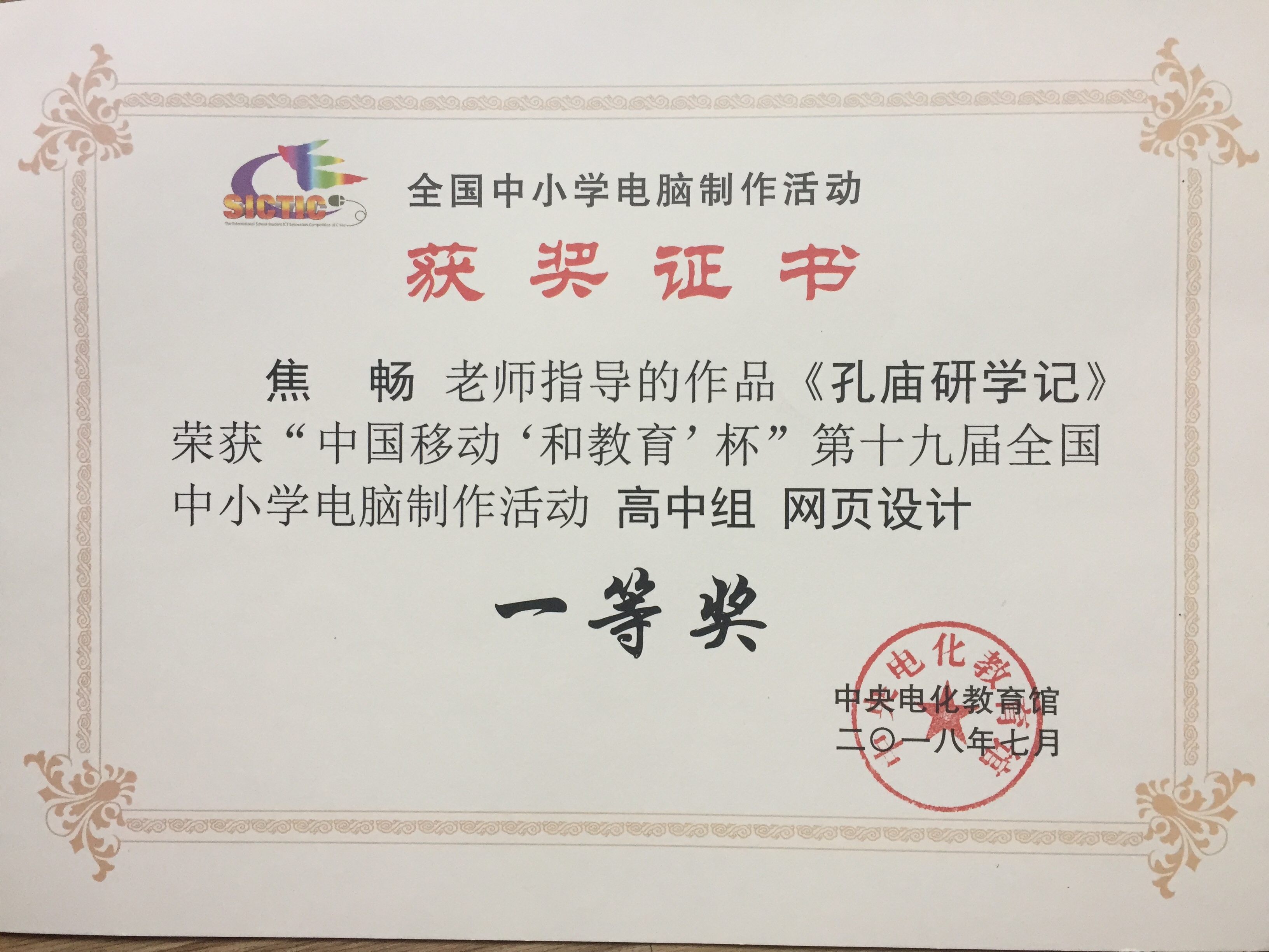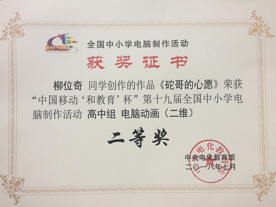 7月17日至21日,由教育部指导,中央电化教育馆、中国移动通信集团公司和江苏省教育厅主办的“中国移动‘和教育’杯”第十九届全国中小学电脑制作比赛活动夏令营在江苏省无锡市锡东高级中学举行。我校1617班肖芊同学网页制作作品《孔庙研学记》、1610班柳位奇同学电脑动画(二维)作品《砣哥的心愿》均入围比赛,经过专家评审、现场技术测试、现场技术答辩三个环节的审核,分别荣获全国一等奖、二等奖。